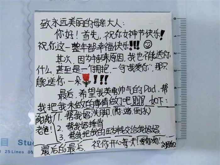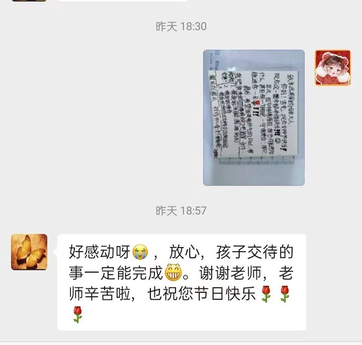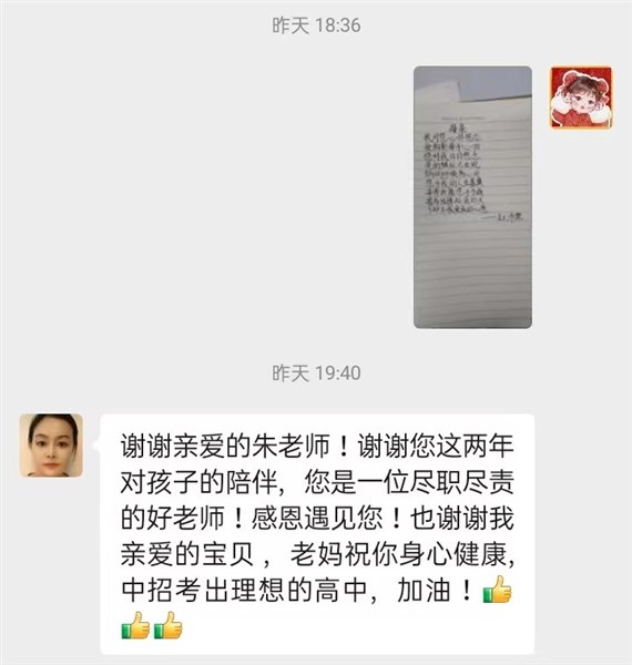 于是,就相应的收到了每个家长的恢复。他们表达了收到孩子的祝福的激动与幸福,也有让我传达孩子家里都好不要担心,要全身心投入备考,决战中招的。有一个家长的恢复我印象很深刻。那是一个父亲收到孩子写给妈妈的祝福纸条后对孩子的承诺:“好感动啊,放心,孩子交代的事情一定完成。谢谢老师,老师辛苦啦,也祝您节日快乐。”