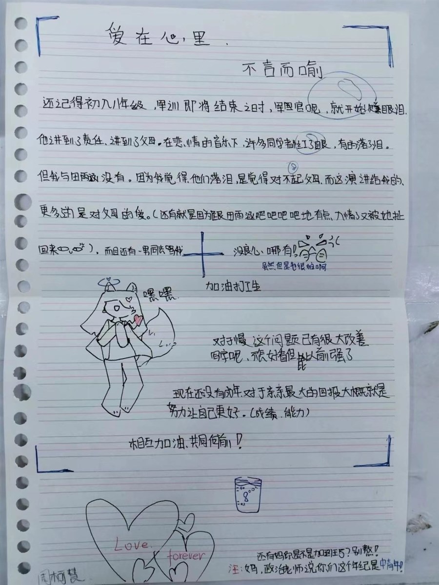 我把每个孩子的祝福,长长的,短短的,语言华丽的,朴实的,图文并茂的,单一小纸条的,一一拍成照片分别发给了他们的父母。