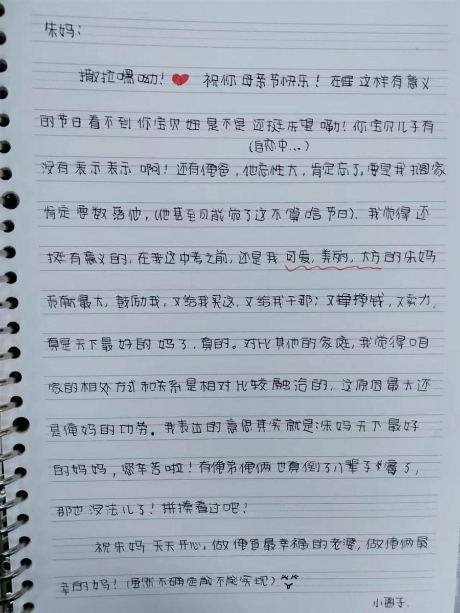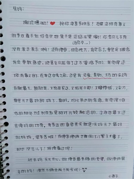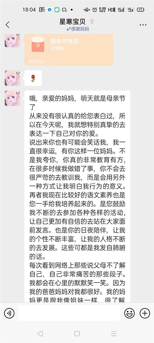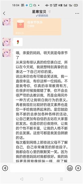吃晚饭时,收到了在家上网课的女儿给我打来的电话,问我在学校怎么样啊,有没有想她,说明天就是母亲节了,她给我写了一封信,怕我忙看不到,提醒我看微信信息。挂了电话,我幸福地打开了微信。果真,长长的一段文字,是她平时很少说的话,看得我两眼模糊。竟然,还在后面给我发了一个5.20元的红包。我是九年级的老师,担任一个班的班主任及两个班的语文课。女儿七年级,虽然跟我同一所中学,但因为工作忙,一周也难得见上两面。小学没管过她,中学又没怎么管过她。总觉得对孩子亏欠太多。但孩子的理解懂事常常让我感动。不几分钟又收到了老公发的红包与祝福。