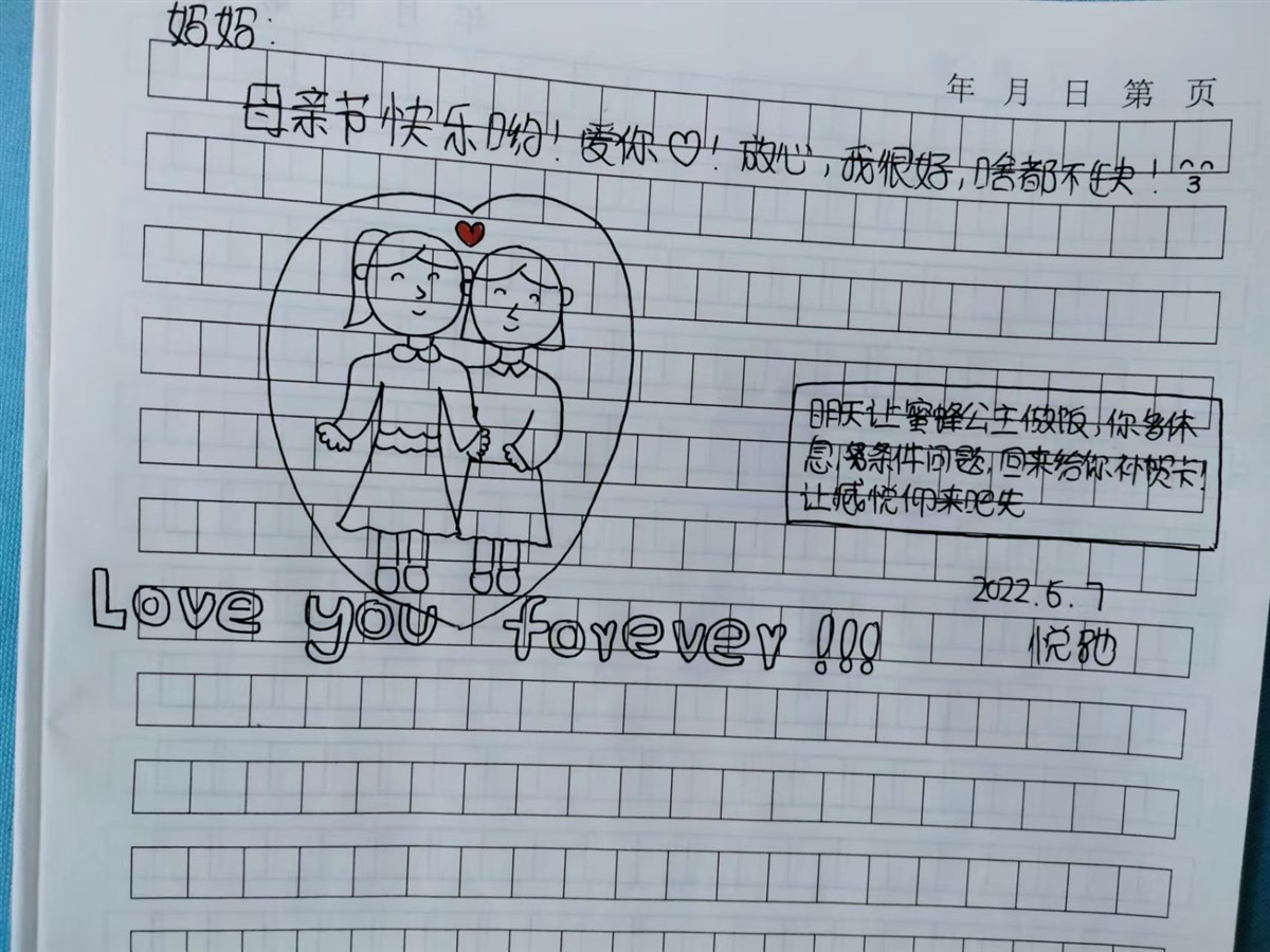 怎么给妈妈过母亲节呢?让每个人给妈妈录一段小视频,不现实,因为,还要正常上课。于是,在语文课时,我说:“孩子们,明天就是母亲节了,可是因为疫情,我们不能陪在妈妈的身边,怎么给妈妈送上祝福呢!”“老师,给老妈一个隔空拥抱吧。”博涵喊。大家善意地笑了起来。