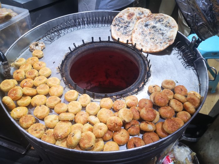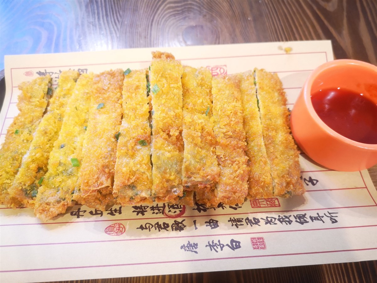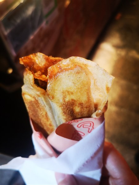 做法:油条和葱段夹入薄饼,刷上甜酱,再用铁板压烤至两面金黄。 口感:葱香可口,有嚼劲儿!