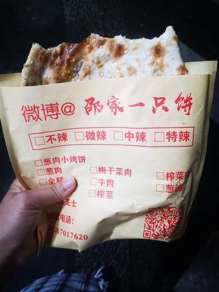 典故:南宋民族英雄岳飞被秦桧所害,杭州面食店老板王二用两面团按在一起油炸发明了“油炸桧”就是今天的“油条”,后又将油条和葱段卷入薄饼压烤发明了“葱包桧”,流传至今。 你看,原来我们不只是在品尝一种食物,更是在回味一段历史啊!鼓楼美食街的网红孙奶奶葱包桧,深受食客喜爱。因为好奇它的名字,于是问了老板为什么食物的名字叫“葱包桧”,于是阿姨给我讲了这其中的小故事,听后豁然开朗!民族英雄岳飞可敬,卑鄙秦桧可恶可憎,杭州百姓可亲可爱! 邵家一只饼