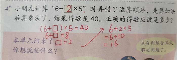 尤其是像这种由于运算顺序有误导致得数错误的题目,有很多学生直接就将方格里是2代入源算式里计算。问2是怎么得出的,却说不出个所以然。所以方格中的数如何得出作为了讲解这道题的重点。