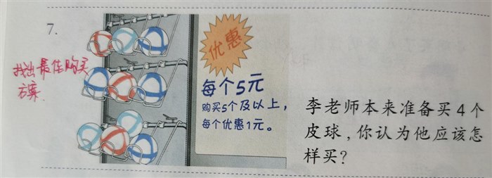 比如上面这一题,首先要了解“优惠”的意思,明白买5个以下和5个及以上的价位是不同的。首先要先清楚李老师准备花多少钱买皮球,之后思考如果可以买5个及以上的皮球每个应该是多少钱,最后试一试,用准备花的钱数除以优惠后的价钱,发现可以买5个,也就是证明可以享受此优惠。初看这道题,班里几乎无人知道从何处下手思考,可见学生的分析问题和解决问题的能力还是很欠缺的。