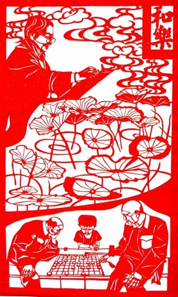 纵横捭阖间, 和乐唱手弹。 人生长如此, 何不惹人羡? 剪纸:李文峰
