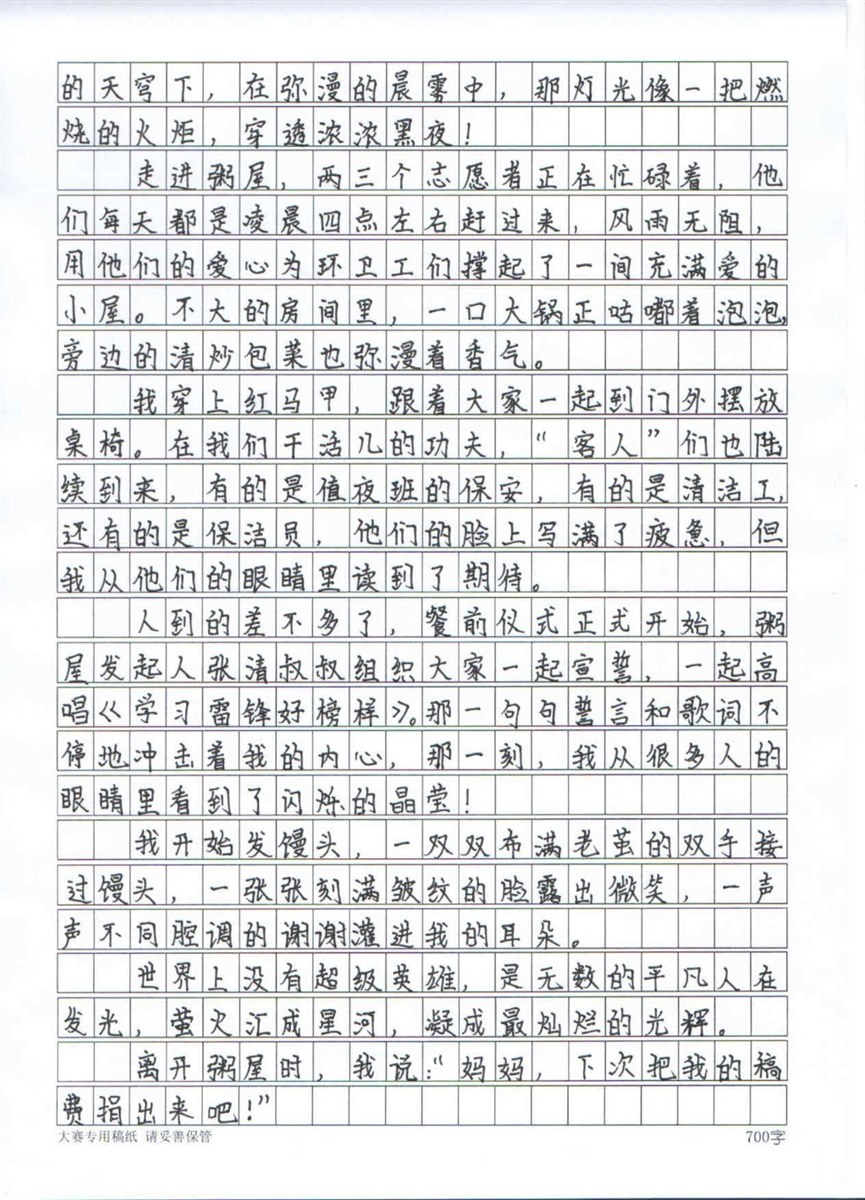 人到得差不多了,餐前仪式正式开始,粥屋发起人张清叔叔组织大家一起宣誓,一起高唱《学习雷锋好榜样》。那一句句誓言和歌词不停地冲击着我的内心,那一刻,我从很多人的眼睛里看到了闪烁的晶莹!