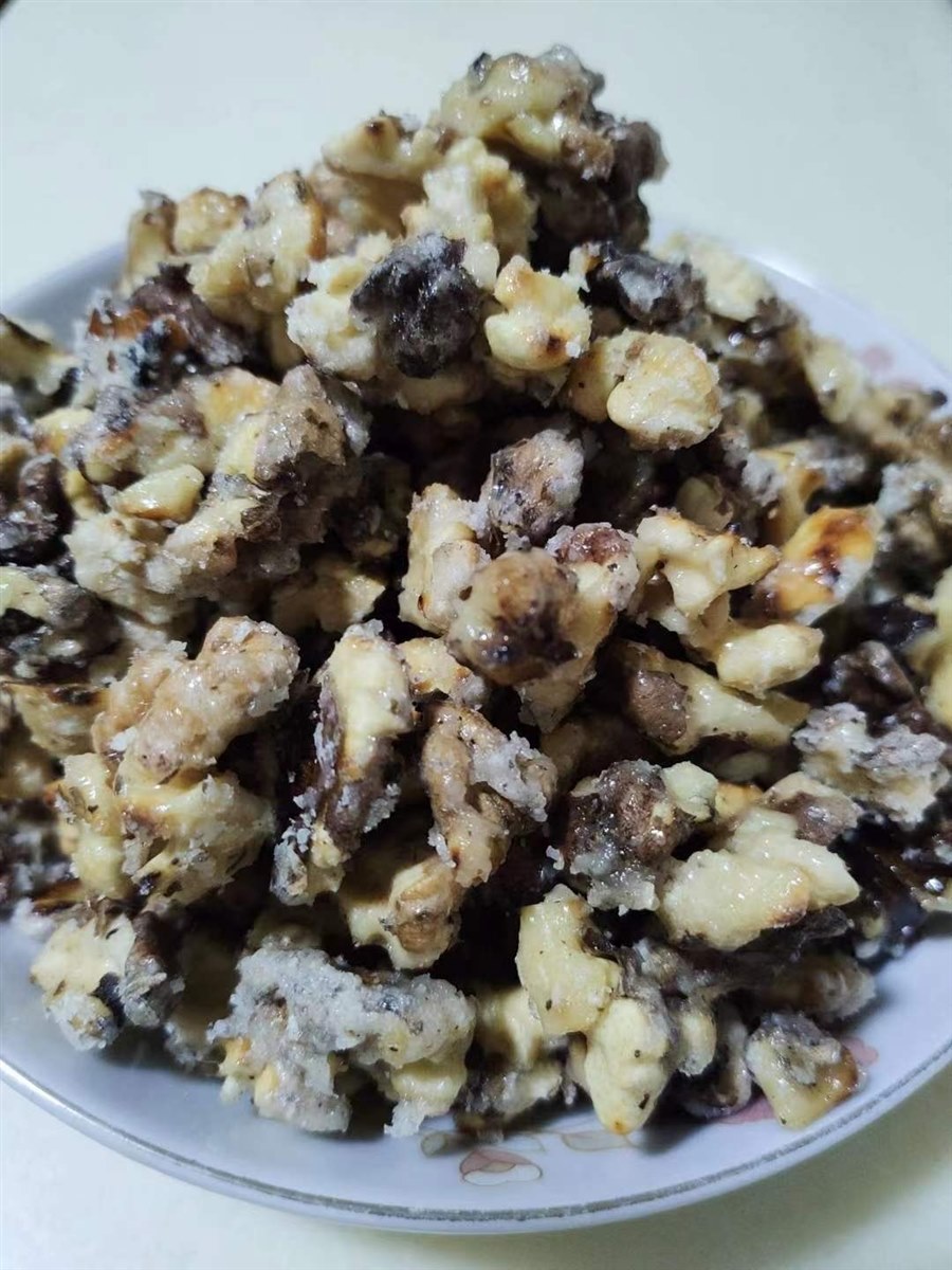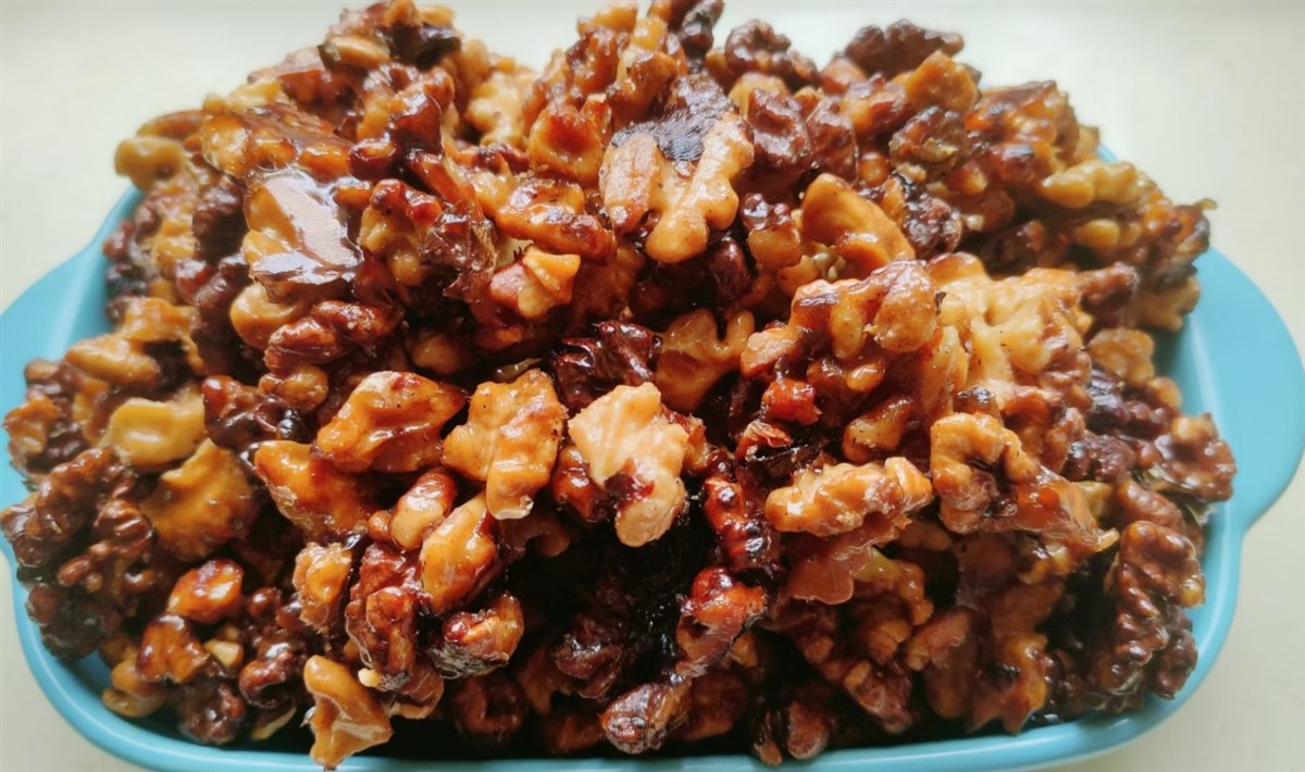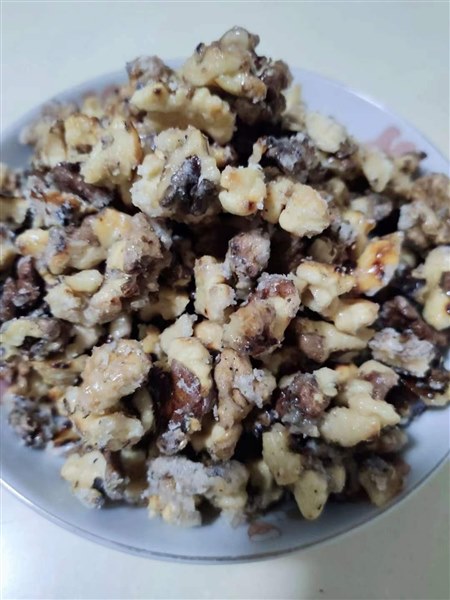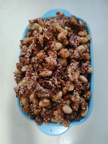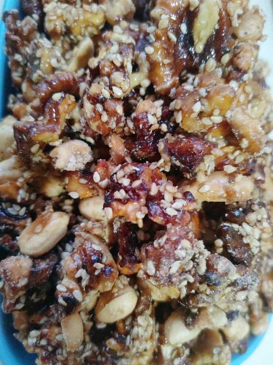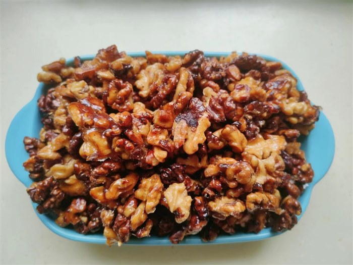 | 我发觉,随着生活水平的不断提高,我和家人的口味宽了许多,也杂了许多,同时嘴巴也刁了许多。我特别喜欢汪曾祺老先生说法:一个人的口味要宽一点,杂一点,南甜北咸东辣西酸都去尝尝。 所以,我很享受美食带来的美好时光,不管是亲自动手制作还是纯粹享用,有美食的每个日常都温情脉脉,香香甜甜。 不知道从什么时候开始,曾经觉得好吃的核桃(原味)竟然没人喜欢吃了。为了消化家里的核桃,也为了让妞妞能吃点儿核桃,这段时间我可是下足了功夫,变着花样做了几种美味的核桃。没想不吃核桃的俩妞妞,在我美食的引诱下喜欢吃了,直说这核桃经过妈妈的手变得如此美味。哈哈,又一次让你们的小挑食败给了我的好手艺。 有微友问我是怎么做的,我就整理了制作方法发给她,我爱美食更爱分享,因为分享一份甜蜜会得到双倍的快乐。 我做的有挂霜核桃和琥珀核桃,方法基本相似,只不过是熬糖水时搅拌频率不同,就出现了不同的结糖状态。我总是随心而欲呈现出金黄明亮的琥珀色我喜欢,呈现出一层白霜的我也喜欢,还可以加入一些花生仁和芝麻粒,醇香的口感会更浓一些。 用量我都是估约摸的,每次总是做一大盘,有时用白砂糖有时用冰糖,好像差距不大也不影响口感。糖根据核桃的多少口感的甜度自行把握,冰糖我会用手抓一小把,白砂糖用吃饭的小勺子盛五勺即可,糖和水比例大概是2比1。 制作方法简单如下: 首先,把核桃炒出香味,放凉后去皮,尽量去能去多少去多少,花生也炒出香味放凉去皮。(我们家经常有炒好的花生仁和核桃仁,想吃甜味了可以直接去做。) 接着,不粘锅(铁锅会很粘)倒入冰糖和水,或用白砂糖也行,开火让糖融化。稍稍翻动一下就行,等糖水熬出大泡泡且水明显减少了,颜色变深气泡变细腻呈现出金黄琥珀色,就把核桃花生倒入翻炒至每个都均匀裹上糖汁,转小火继续翻炒至水分收干。 最后,关火轻轻翻动几下就可以出锅了,也可以在锅里放凉再盛出,裹好糖浆的核桃仁色泽金灿灿的、晶莹透亮,即使有粘连在一起的,轻轻用手一掰就开了,也不粘手。 用不粘锅翻动时不会粘,关火后及时倒出锅里会很干净,即使会有一些糖,用水很容易刷干净。如果用铁锅翻炒会很粘,且不太好清洗。 温馨提示:熬制糖水时,如果翻炒次数少做出来的就是亮晶晶的琥珀核桃;如果熬制糖水时间不够且搅拌太勤就容易出砂,就是一层结白的挂霜核桃。不管是琥珀核桃还是挂霜核桃,口感都是又香又甜,拿在手里也不粘。加一些芝麻粒和花生仁,味道会更香,外酥内香,甜而不腻,真是唇齿留香回味无穷。 这样经过加工改良的核桃仁,已经没有了核桃皮的那一丝苦涩,留下的只有核桃的酥脆和香甜。反正,我是很喜欢吃这样的核桃,妞妞也喜欢吃,但是一次不能吃太多哦,容易长肉肉哦。 好了,看图吧,有没有很想吃呢? 琥珀核桃,亮晶晶金灿灿,更是诱人呢。 这样的核桃喜欢吗?如果喜欢那就动手试一试吧。 |