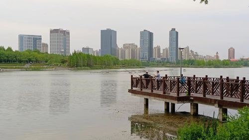 水静湖色秀, 风微绿株柔。 几竿垂钓者, 曲廊聊闲悠。