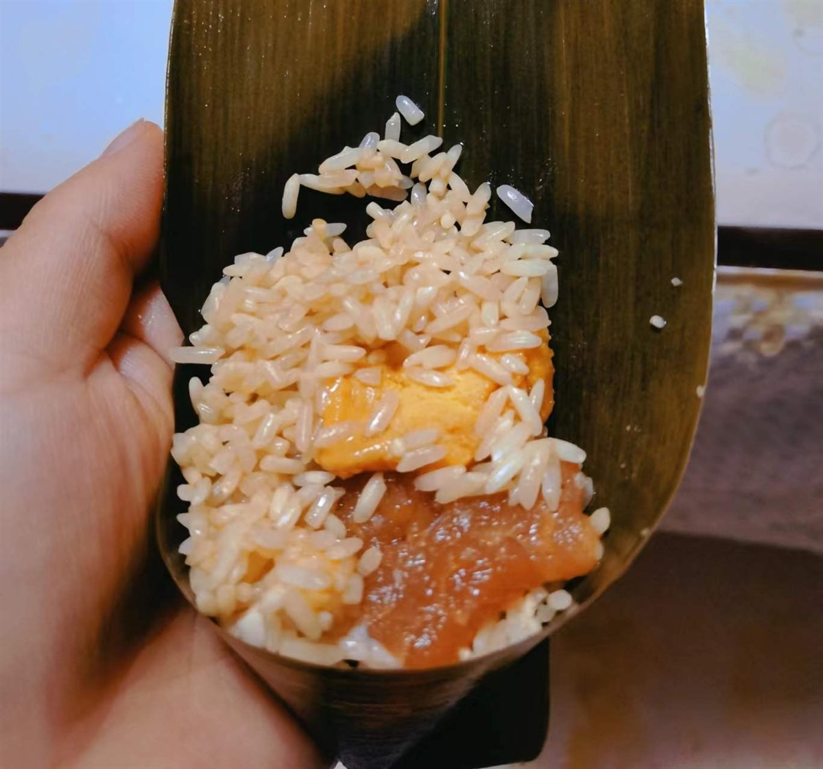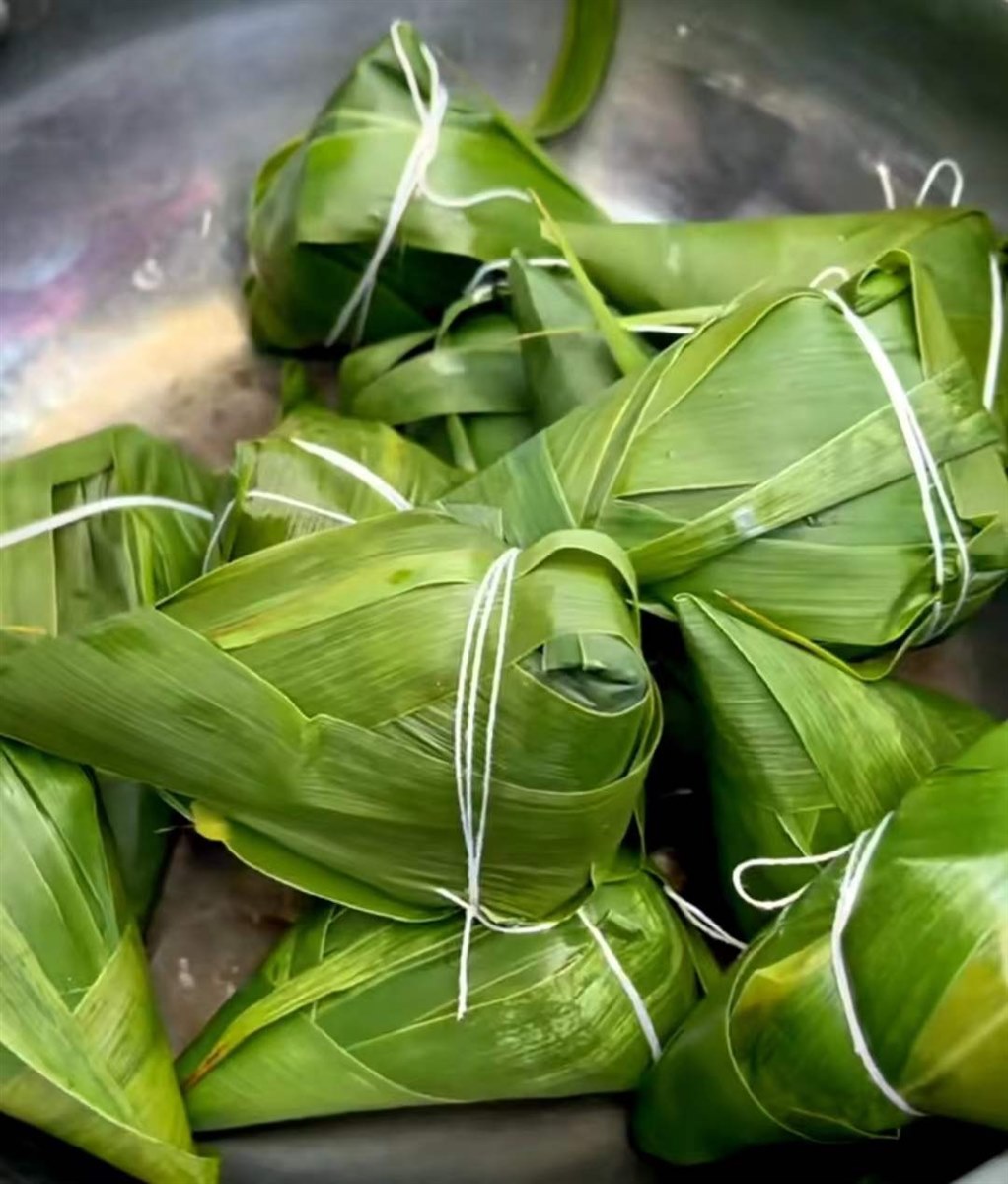 所用食材准备到位了,我和儿子就开工了,首先把粽叶洗干净,在热水中泡软,再准备好枣子、鸡蛋、肉等做馅儿,再把长长的粽叶折叠围拢来,做成一个窝,中间放进调配好的糯米和硬米,包出棱角,然后把馅儿放在米里和一起活。合在一起揉匀,最后把粽叶儿包着的粽子做成三角的形状。