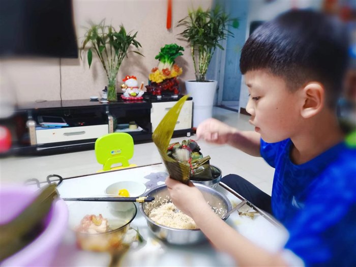 包好的粽子放进锅里用猛火煮大约一一个小时之后改成文火再煮30分钟就可以啦。在煮粽子的过程中,儿子总是急不可耐地揭开锅盖儿查看情况,因为从锅里飘出那粽子的香气,馋得他直流口水,等待的时间总是特别的漫长。看到热气腾腾的粽子,从锅里解放出来的那一刻,他高兴的手舞足蹈,放在碗里用筷子拨开,就可以看到里面金黄松软的粽肉啦,咬一口美味无比,这次儿子吃了四个,我也暗自欣喜!