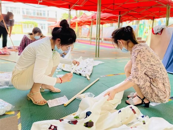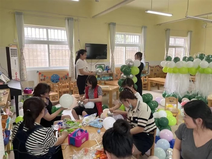 为了给孩子们打造美丽又富有仪式感的环境,我们兵分几路迅速行动。打气球的、系气球的、搭帐篷的、挂风车的、水池抽水的……大家各司其职,好不热闹。