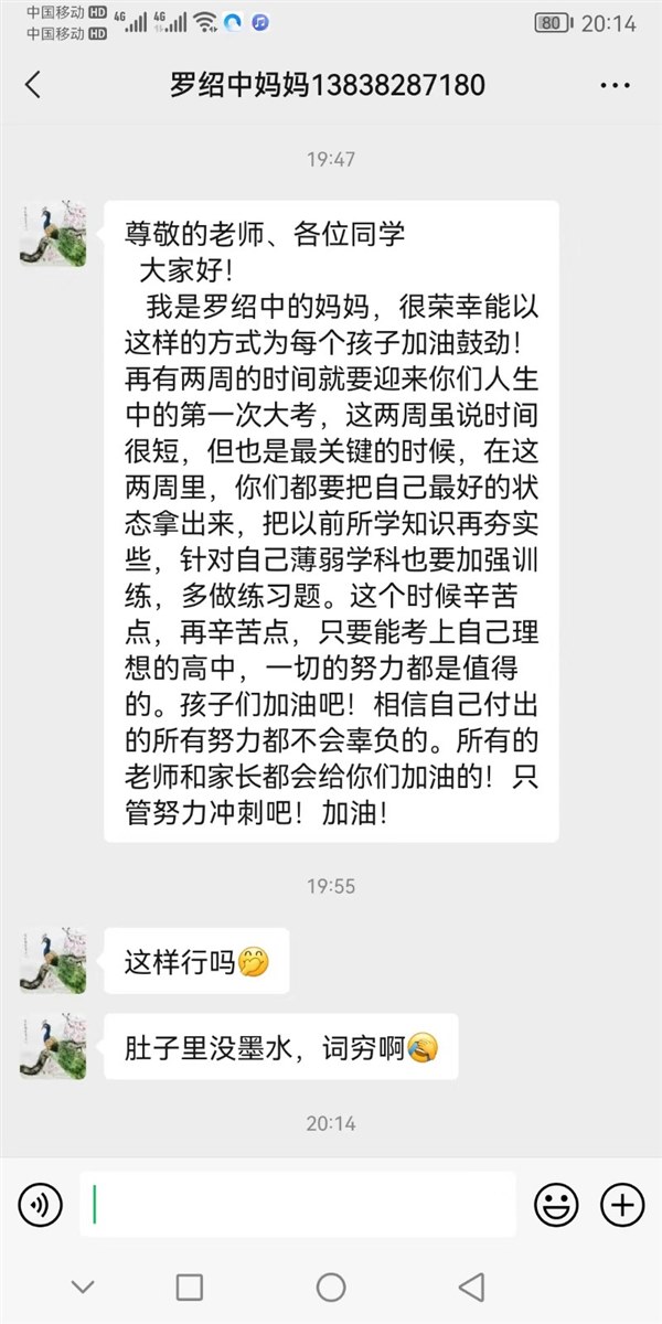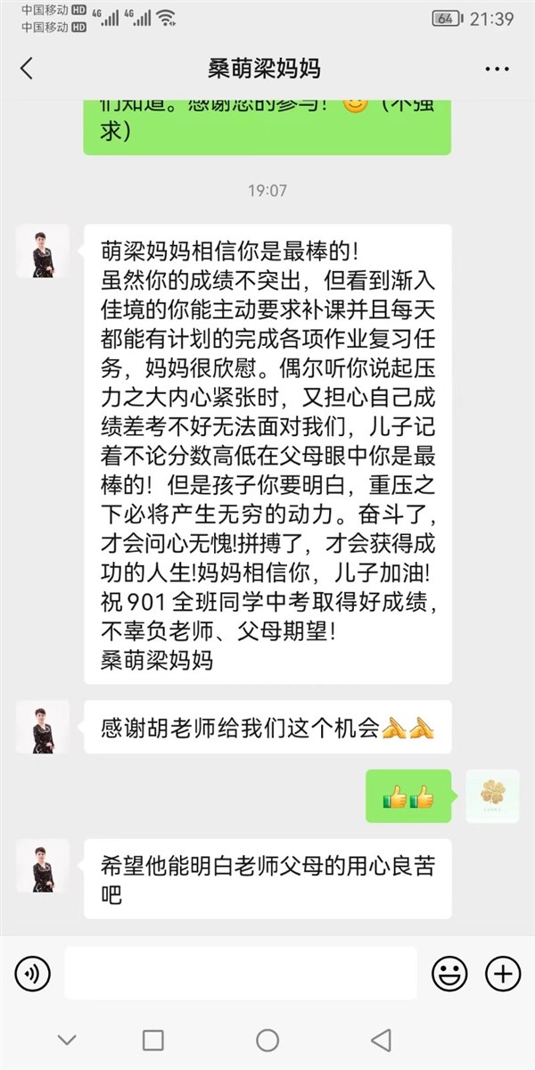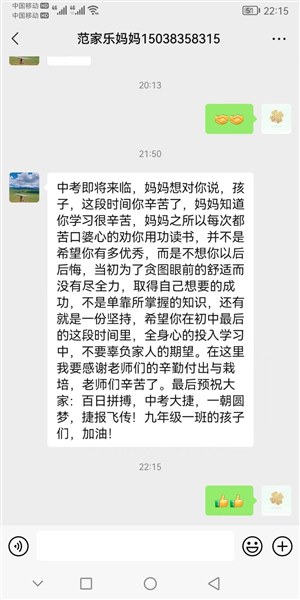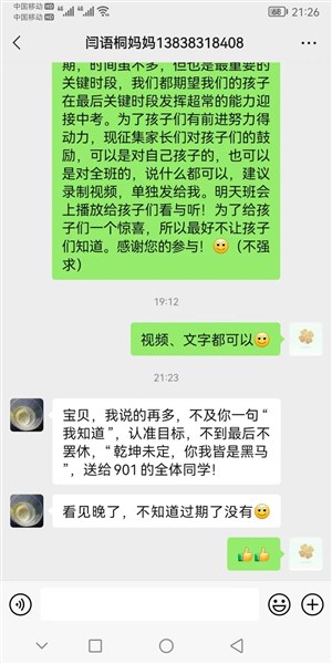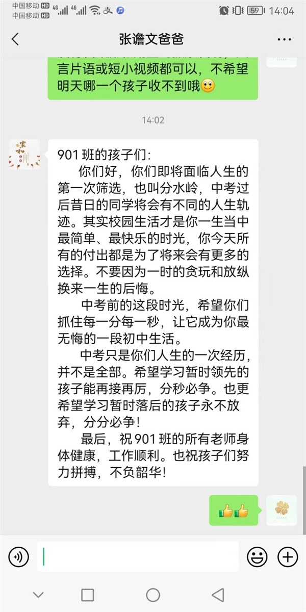 中考的号角声已经吹响,最后期望我们901班的所有的孩子们在最后的关键时段“有志者事竟成,破釜沉舟,百二秦关终属楚;苦心人,天不负,卧薪尝胆,三千越甲可吞吴。”愿你们怀揣梦想,砥砺前行,圆梦中考,不负韶华!加油,孩子们!