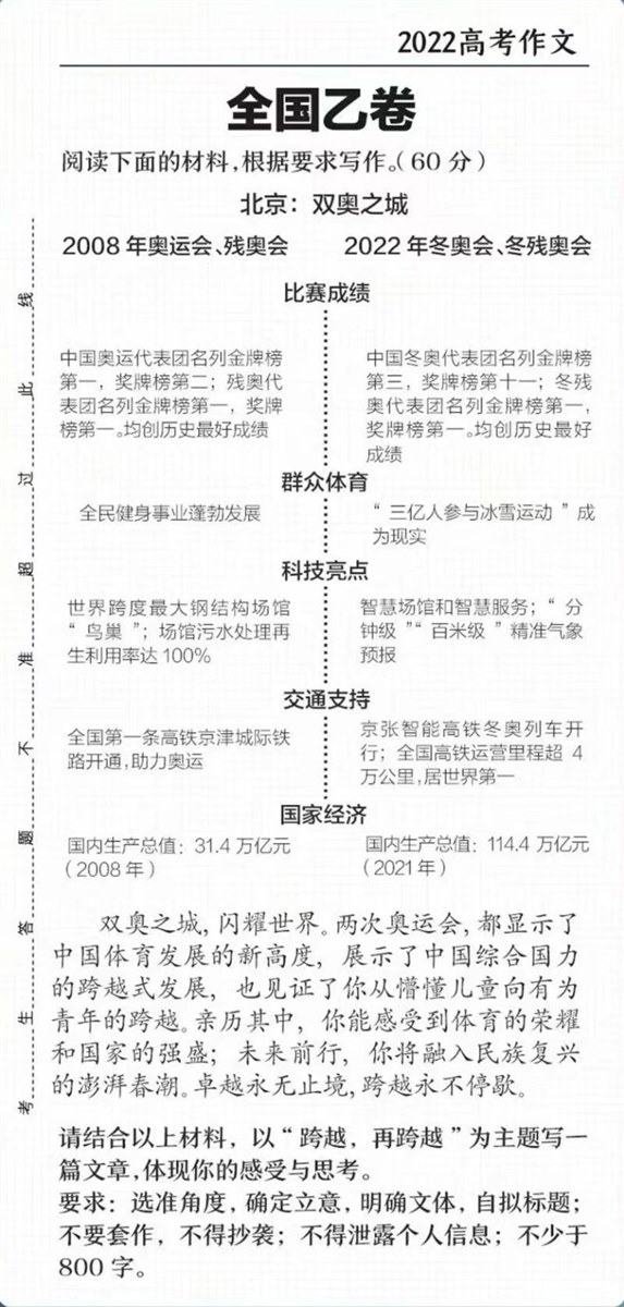 北京,作为世界唯一的一座双奥之城,从2008年到2022年的两次奥运会,不仅显示了中国体育发展的新高度,而且展示了中国综合国力、中华自信的跨越式发展。回顾两届奥运会,除了自豪,还有深深的感动,跨越,远不止于此。是什么让我国在近些年的发展中实现跨越式发展呢? 跨越来自不断的发展。作为我国,在近些年跨越式发展史举世瞩目的,仅从2008年到2022年的奥运会举办就可以管中窥豹。2008年,我国生产总值31.4万亿元,而2021年,我国生产总值达114.4万亿元。只有不断发展,才能使综合国力增强。再如,2008年,全国第一条高铁京津城际铁路开通,助力奥运;2022年,京张智能高铁冬奥列车开行,全国高铁运营里程超4万公里,居世界第一。我们都能从这些数据中看到:发展才是硬道理。只有发展,才能走向卓越。 跨越来自不断的强大。作为一个中国人,我们见证了祖国从站起来到富起来的过程,在日益强大的今日,更需要我们每位中国人为之奋斗。仅从奥运会的科技角度,我们就能感受到科技的力量。在2008年的奥运会上,我们建造了世界跨度最大钢结构场馆“鸟巢”,场馆污水处理再生利用率达100%。而在2022年的冬奥会场馆的建设方面,更是凸显人文,智慧场馆和智慧服务,“分钟级”“百米级”精准气象预报,无不为世界瞩目。只有不断强大起来,才能促进高科技迅猛发展,才能引领世界新潮流。 跨越来自不断的追求。有梦想,才会有动力,有追求。中国人自古就有梦想,并为之奋斗。在中国奥运代表团名列金牌榜第一,奖牌榜第二;残奥代表团名列金牌榜第一,奖牌榜第一。均创历史最好成绩。中国冬奥代表团名列金牌榜第三,奖牌榜第十一;冬残奥代表团名列金牌榜第一,奖牌榜第一。均创历史最好成绩。金牌的取得固然重要,每块金牌背后都是一次次拼搏的过程。同时,全民健身事业也得到了蓬勃的发展,“三亿人参与冰雪运动”成为现实。就是有了这样的梦想和追求,才使我们不断走向卓越。 双奥之城,闪耀世界。两次奥运,彰显了中国体育发展的新高度,展示了中国跨越式发展的新历程。卓越永无止境,跨越永不停歇。 附:高考作文题目