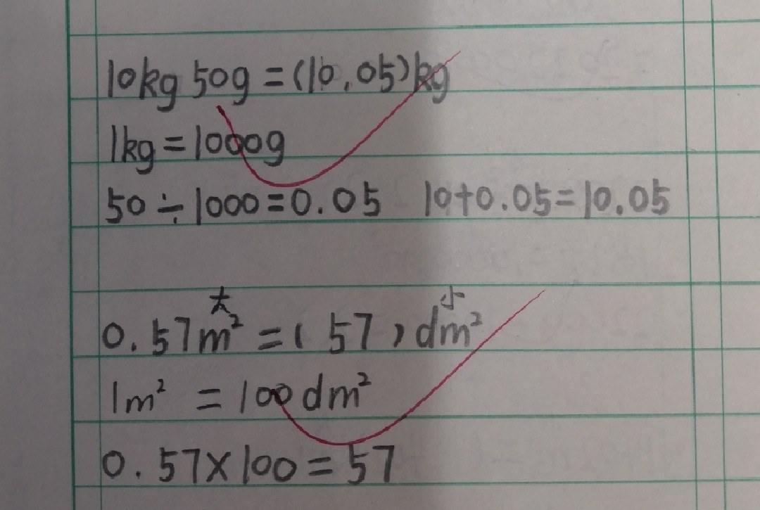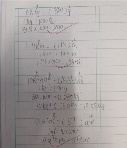 当同学们都记熟以后,我们开始进行挑战,同学们的兴趣很高。于是,我们按照3步法进行挑战单位换算(标大小,写出单位之间的进率,写算式计算),学生做的出乎意料的很好!