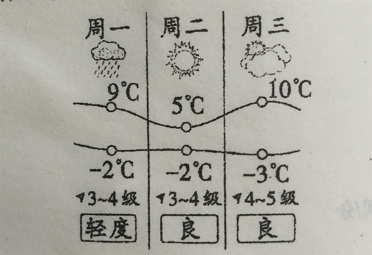 我拿出卷子一看,明明很简单的一道负数练习题,怎么会有这么多学生掉进坑里呢,原来题上给出的是一张天气预报的图片,如图所示,