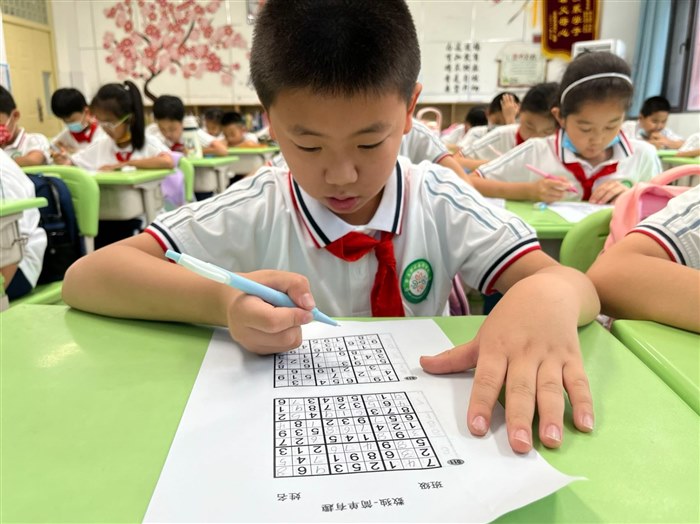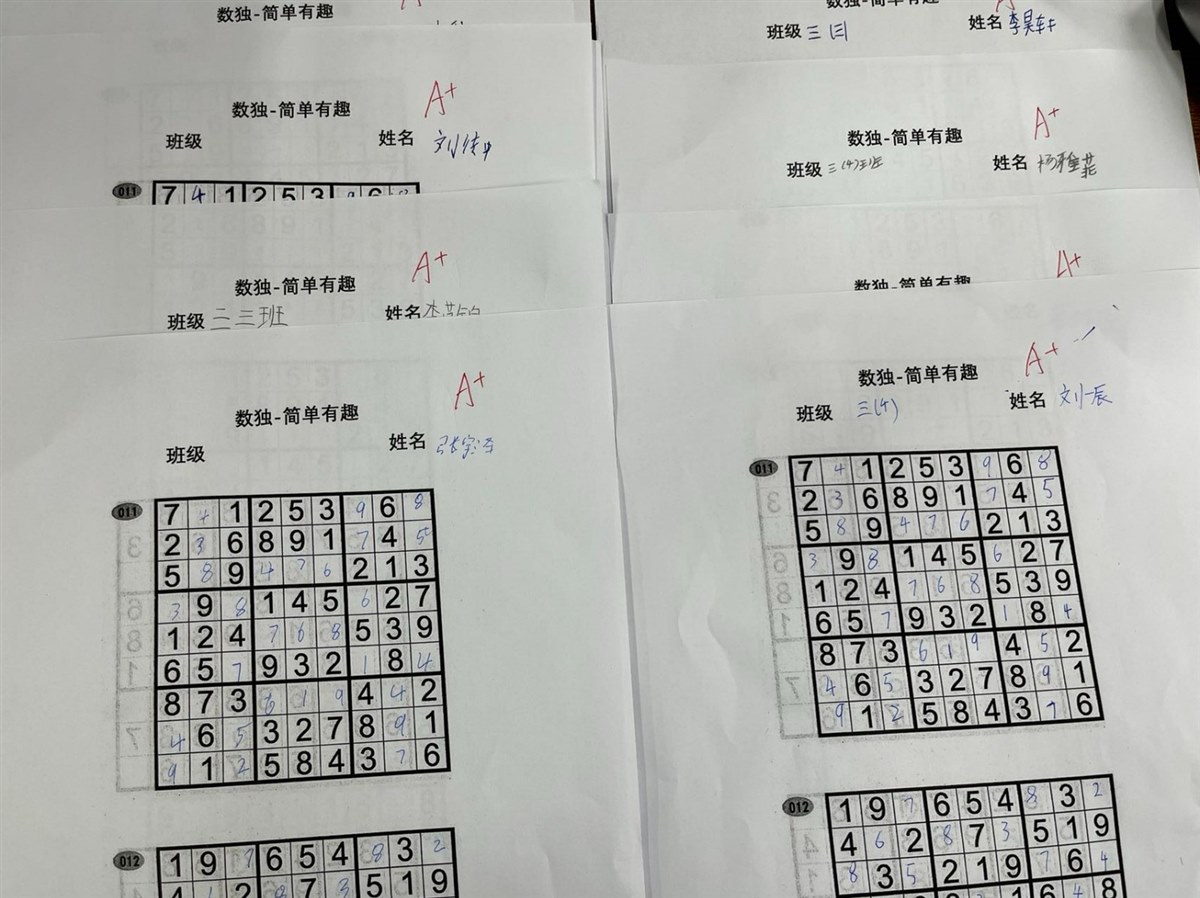 我们在三年级上学期的过程中只开设了数独社团,但是随着学生对数学社团课的热爱,所以在周四的时候又开设了“数你最棒”的社团。两个社团都是由我一个人来带。在每一节数学社团课都是与孩子们“烧脑”时刻。在数学社团中有很多思维敏捷的孩子。很多孩子也在学习了一学期的数独之后,逐渐找到了解题的窍门,解数独的时间也越来越快。在进行每一节数独课之前我都会精心备课,这样才能在社团课上与聪明的学生斗智斗勇。数学社团课上我们经常进行小组pk,同学们能总是在不知不觉中不情愿地结束社团课。