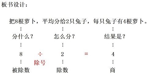 在第一次讲除法的时候,我想既然除法可以用来表示平均分,而平均分的过程可以用三个问题来描述“分什么?”“怎么分?”“结果是?”,那就可以把这一问题和除法的各部分名称相结合,设计一个板书。