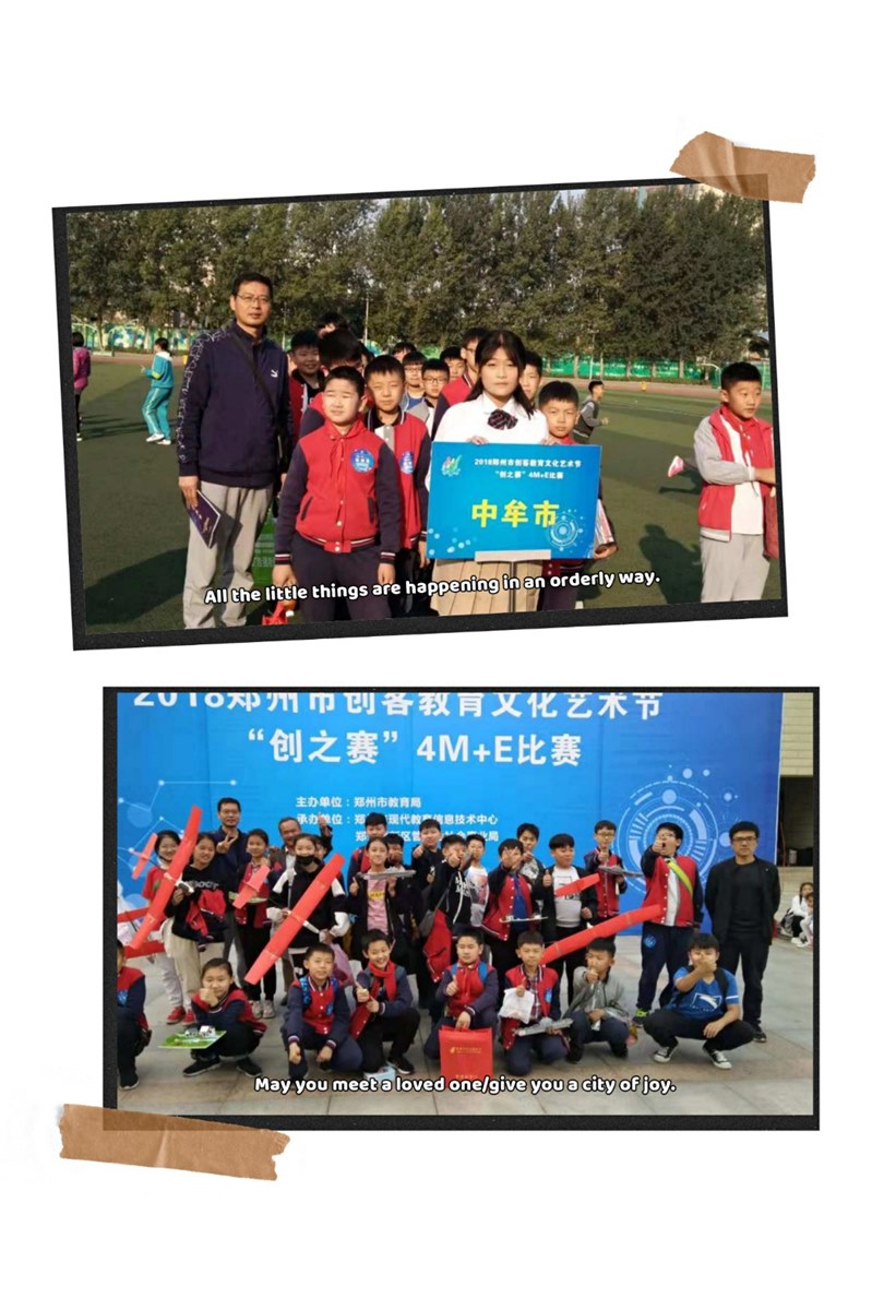 2018年我带着以X旭为主力的代表队参加省、市各级航模船模竞赛和郑州市创客教育文化艺术节“创之赛”4M+E等比赛,先后荣获河南省青少年航海模型教育竞赛(郑州赛区)的比赛一等奖、郑州市青少年航空模型锦标赛小学综合团体第三名等优异成绩。特表别是在“相约魅力中原,拥抱祖国宝岛”2018郑州市青少年航空模型锦标赛上空中技巧飞行赛上,X旭更是凭他娴熟的操作一举获得赛事第一名的好成绩。赛后,他跑到我面前,激动的说:”老师,我说过,长大后,我一定会驾驶战机巡航台湾,拥抱我们美丽的宝岛”!