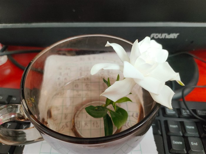前几天我有幸收到了一朵栀子花——洁白、雅致。没等我拿起它 浓稠的香气已经满溢出来,忍不住放在鼻子上贪婪地闻起来。我生怕它在炎热的天气里枯萎掉,就用水杯接满水把栀子花插进去。我伏案批改作业时香气丝丝缕缕地弥散过来,固执地绕鼻不息。使我总不能专心判作业,忍不住望向我的这朵栀子花!