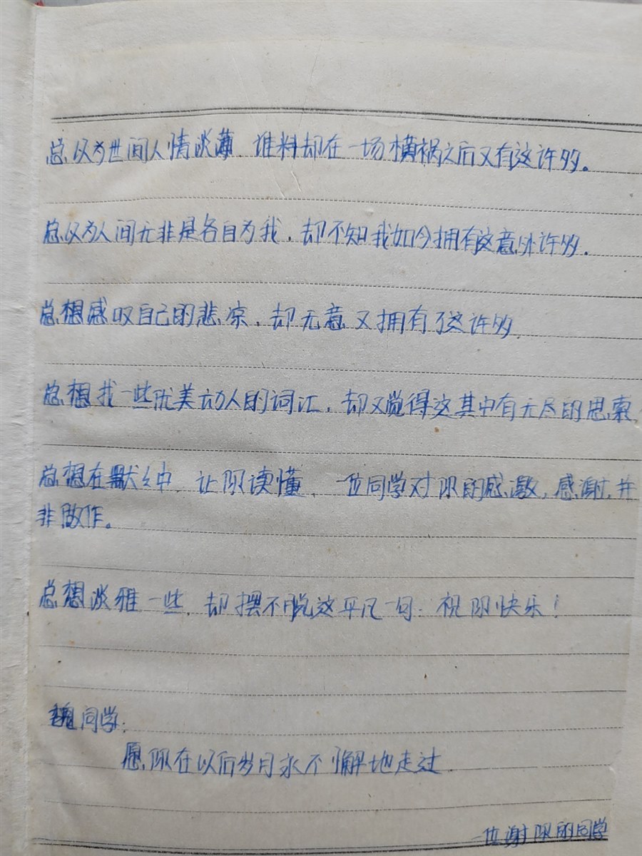 那是三十年前,我在荥阳师范求学的一个夏日清晨,那天,路边的风景和以往似乎也并没什么两样。爱晨跑的我仍像一只善于奔跑的鸵鸟,迈着青春的脚步,奔跑在美丽的郑上路上。约跑出三四公的路程,隐隐听见前面有女孩嘤嘤的啼哭声。近了,又听见一个男子的喊吵:“这不是怪你啊?竟往我的车上撞。”跑到跟前我才发现一个女孩坐在地上,边哭边说:“你怎么不说你是逆行,还骑这么快呀?”和她一起的一个女孩在一旁不停的安慰着。我停了下来,弄清了事情的缘由。原来是我校两名热爱晨跑的女生,在晨跑路上,被一个逆行骑自行车的男子撞在路边的栏杆上,疼的蹲在路上痛哭,可能伤得不轻。此时那男子仍在为自己不想承担任何责任而絮絮叨叨的进行着各种辩解,什么自己车速不高啦,女孩跑得也快啦,并且自己的车子也摔坏了等理由。我听后,来了气,上前大声的说:“住口,你把人都撞伤成这样了,现在最应该做的是把人送到医院去,你说的这些,没有任何一条比先治病救人重要”。可能是他看到身高一米八多的我这样的愤怒、坚定与执着,终于,他终于同意了。 我让另外那名女生去学校通知老师和同学,便带着这名男子,背起受伤女孩向荥阳人民医院跑去。医院急诊室,我刚安顿好被医生包扎治疗好的女孩,学校老师和她的几位同学也匆匆赶到,我帮他们指认了肇事男子后悄悄的离开了医院。 记得是毕业前的那天,一位同学说有人让帮捎给我一个精美的礼品盒,我慢慢打开,是一本非常漂亮的的日记本,翻开扉页,上面几行工整、清秀的蓝笔小楷呈现在眼前: 总以为世间人情淡薄 谁料一场横祸之后又有这么许多