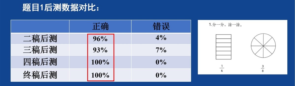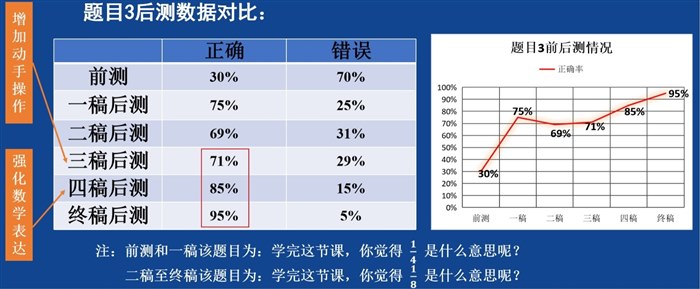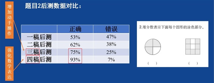 | 《分一分(一)》课例研究之为何改编教材环节 本节课授课时,我们将涂出下面图形1/2的环节改为动手折一折 涂一涂,得到第一个图形(正方形)的1/2,剩下的四个图形男女生分组涂。基于理论,依托学情,结合后测,我们这样改动是有效的。以下为具体阐述: 教材中是这样设计的,分别涂出下面图形的1/2。  这是促进学生深入理解分数意义的活动。教材给出了五个图形,有基础图形、组合图形和不规则图形。因此,在这一环节中,学生呈现的1/2一定是多种多样的,这就为我们理解“分数是表示图形的涂色部分与整个图形之间关系的一个数”提供了丰富的素材。而涂色形状不一样,却都能表示出1/2,通过对不同图形涂色方式的横向对比,也体现出了分数的一般性。因此,我们十分认同教材的编写。教学设计一稿和二稿我们都是按照教材环节进行授课,而且在这一环节之前已经将1/2的意义抽象出来了。但是到这一环节展示作品时,教师提问:“你是如何得到这个图形的 1/2”,学生是像视频中这样描述的【片段1】。像视频呈现的那样,大多数学生是基于“一半”进行描述的,可以看出学生能够感知到1/2的意义,但不会用数学的语言进行表达。 通过对文献的解读,符号意识的培养与发展,是离不开学生的直观操作活动的。因此,我们尝试将这一环节改为动手操作,折一折,涂一涂,得到正方形的1/2,并强化对分数意义的数学表达。这样,就将一个静态的学习素材用具体情境加直观操作的动态形式展现出来,促进学生对1/2意义的理解。相较于在方格纸上涂色,学生用折一折的方式能够更加直观、多样化的表示出自己的想法,并且能够基于操作层面描述清楚自己是如何得到这个图形的1/2的。如视频所示【片段2】。我们可以看到,学生基于操作层面描述的很清楚。 教师将两种涂色方法放在一起(横着对折涂1份与斜着对折涂1份),提出问题:涂色方法不同,却都能表示出这个正方形的1/2,他们在表示的时候有没有什么共同之处呢?引发学生交流讨论,突出分数的本质,抽象出1/2的意义,并将其板书出来。再让同桌互相说一说1/2的意义。这时,学生对1/2意义的表达就很准确了。如视频所示【片段3】由于正方形操作起来比较简单,因此这样设计既抓住了学生的学习资源,又符合学生在具体情境中直观操作的学习特点,助力学生对分数意义的第一次理解。通过这个活动,学生就在头脑中建构了1/2的概念,为统筹课堂时间,剩下的图形只需涂色即可,男女生分组涂一涂,将1/2从特殊走向一般,加深学生对1/2意义的理解。 同时,后测也能够看出我们这一环节的改变是有效的。这是第1题的答题情况。该题目较简单,每次授课正确率都比较高,说明通过上课,学生能够初步认识分数并建立起分数的模型。 这是第2题的答题情况。我们可以看到,增加动手操作环节后,三稿后测的正确率相比于前两次有了一定提高,达到了75%。而四稿在动手操作的基础上又强化了数学表达,正确率达到了93%。可见,动手操作、合作交流、数学表达等活动,有利于帮助学生理解分数的意义。  这是第3题的答题情况。本题前测正确率仅为30%,而通过课堂学习,学生每次的正确率都有所提高,而且可以看到,通过一次次试课,该题的正确率是在逐步提高的。可以看出,学生的学习是一个循序渐进的过程,在本节课的教学中,教师注重让学生经历分数产生的过程,学生也在不断的动手操作和数学表达的过程中,逐步建立起分数的概念、理解分数的意义。  |