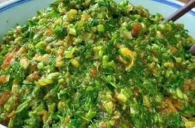 这个时候小茴香已经晾干水分了,将小茴香切碎,加入一勺食用碱。茴香里加点食用碱,可以使小茴香的口感更鲜嫩,吃起来不柴,而且能保持小茴香的翠绿。用手将小茴香抓拌均匀,抓拌至小茴香出水的状态就可以,然后将小茴香挤干里面的水分,放在肉馅里搅拌均匀,茴香饺子馅就做好了。饺子好不好吃?主要在于调馅了。