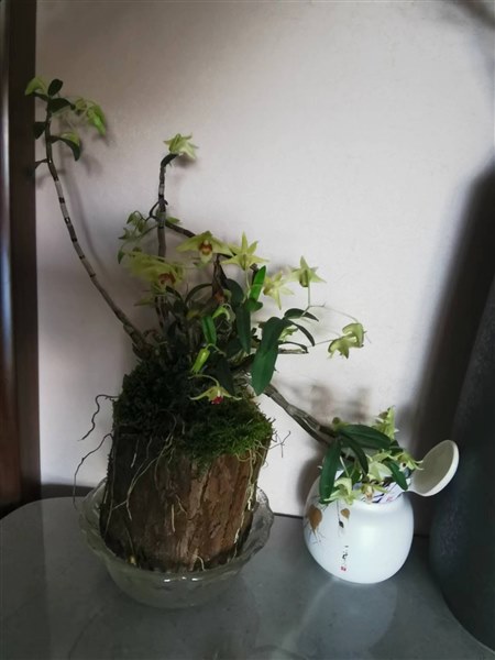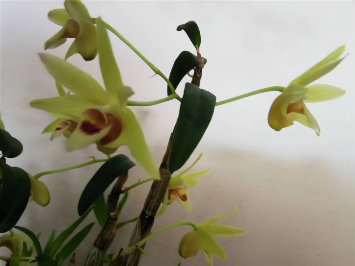 大概补充了三四次水后,某日清晨,突然发现石斛根节由灰白转褐绿,其顶四处开花。花多成绿黄色,中心有点红,娇嫩可爱,清新飘逸。刹那间扑面而来一种明艳而高洁的气息,不能不让人对它高看一眼,多看两眼。