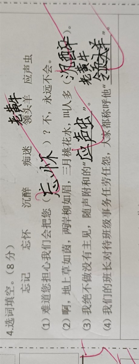 | 大学路二小 张锐敏 今天卷子改完了,翻看卷子的时候,有一套题引发了我的思考,这道题不难,题目是这样的: 这道题的第一小题错的特别多,我们班做对的只有五个同学,问了其它几个平行班的老师,这道题做对的也寥寥无几,每个班基本上只有一、两个同学做对,据这几名老师说做对的同学程度都不是特别好,大概率是蒙对的,甚至有两位老师说这道题她们的第一反应也应该选“忘记”这个词。