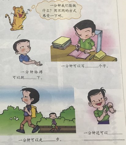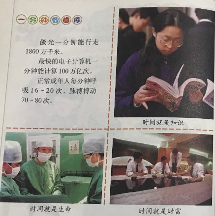激光一分钟能行走1800万千米,最快的电子计算机1分钟能计算 100 万亿次。正常成年人每分钟呼吸16-20次,冰搏搏动70~80次,一分钟成年人能走90-120步等等。对于一分钟数据库你们了解了一分钟的概念了吗,说一说你对一分钟的时间的体会。请看图:时间就是知识、时间就是生命、时间就是财富,思考一分钟对你来说是什么? 感受时间: