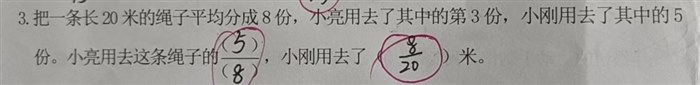填空题第3题 这道题我们班错了40人,主要考察的是分数的意义,同时也考察学生是否认真审题,第一个空错的不是太多,主要是第二个空,个别学生不会用分数表示,又不会计算成小数,或者没有看清楚问题是小刚用去的具体的量。其实这一题,在考试之前才讲过及其类似的一题,但是学生还是掌握的不好。这个易错点,在今后教学时还需要在理解得基础上多强调,多练习。