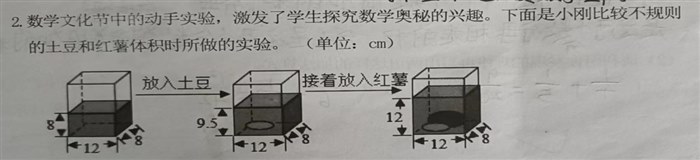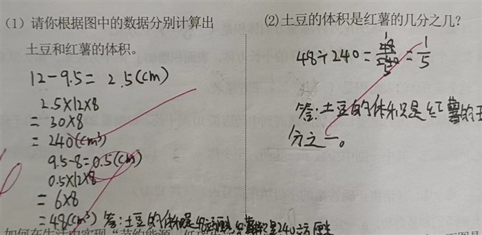 解决问题的第2题  这一题,也是让我很生气的一题,好多同学不是不会做,而是计算错误。这一题并不难,和课本上的放小球题类似,甚至还比小球题简单,复习期间也做过类似的问题,但是个别同学不认真审题,没有用心思考,求出的高度不知道是土豆还是红薯还是它们两个的,再加上计算,非常不认真,只有一位小数,也算不对,只要第(1)小题计算错误,那么第(2)小题就不会正确,还有的同学不看清问题,结果没有约成最简分数。一共6分的题,扣3分以上的人都有30人,只要被扣分的一共40人,这再次说明考试时学生的态度是多么重要,考前的要求和提醒也必不可少。
