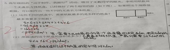 解决问题的第5题 这一题,有两个小题,第(1)题:需要纸板最多的是怎样的纸盒?最多需要多少纸板?从问题来看,需要纸板最多的情况,在平时的练习中没有见过,一般都是问需要纸板最少,这说明出题人考察学生的逆向思维,而且问题还问是怎样的纸板?这样的问法,也很少见,学生不知如何回答,所以从整体上来说,这一题,是学生比较陌生的题型,思维方向也不易考虑到,因此出错的非常多,我们班一共有52人出错。这再次提醒老师,在今后的教学中,要培养学生举一反三的能力,灵活分析问题的能力,逆向思维的能力等。第(2)题求体积,比较简单,只要找出长宽高,认真计算就是全对。