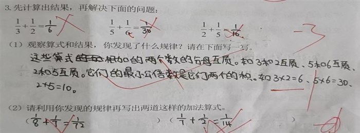 计算园地的第3题  这道题,是我们班失分最严重的一题,其中有5个人,把加法竟然看成了减法,满分7分,一分不得或最多得一分。这充分说明考试期间,心不静,态度不够认真。这一题,我们班一共有55人被扣分,主要是第一问:你发现了什么规律?规律主要有两点:1、两个分数的分子都是1,分母是互质关系;2、分母相加的和做得数的分子,分母相乘的积做得数的分母。大部分学生只写出来了其中1条,满分2分,只得1分,还有的学生叙述不完整,归纳得不全面,才导致失分严重。这一题的规律并不难,还是课本上的类型,但是网课期间学习的,并且在校复习阶段,也没有重点复习,这是老师没有抓住重点,没有紧扣课本,在今后的教学中,一定要抓课本,抓课本。
