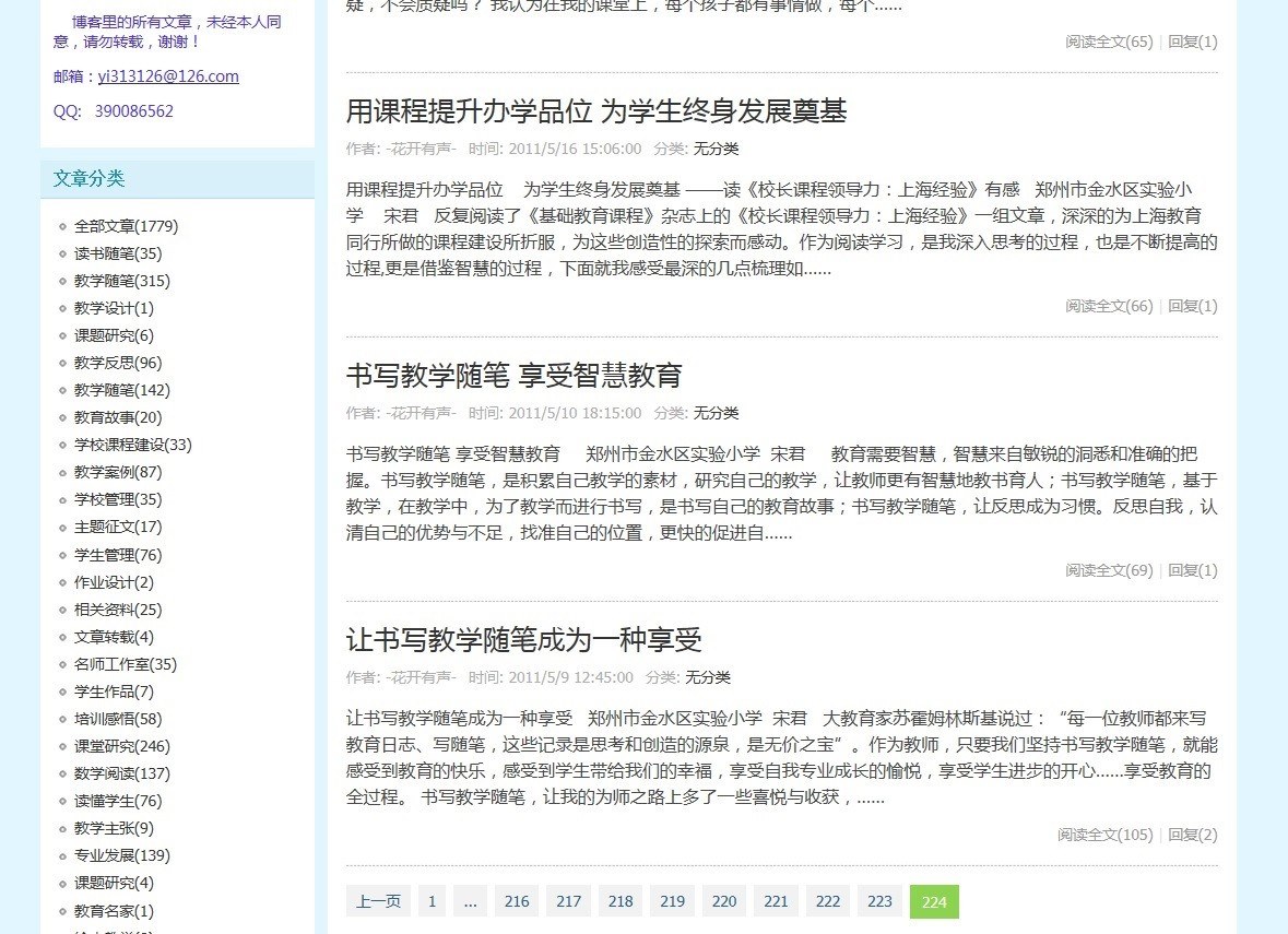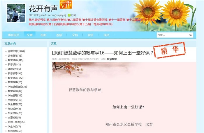 我是2011年在郑州市教育局网站上注册博客,开启写博之旅。回顾11年的写博之路,我没有放弃,从未间断,一直坚持写博,既幸福,又感动。在写博中助力自我的专业发展。 故事1:我的博文为什么没有成为精华帖 有老师问我:为什么我的博文写得那么好,不是精华帖。为什么有些文章不是很好,但却成为精华帖。因为编辑批改文章的时段不同、心情不同、爱好不同等,文字本身都是有感情的,不必在意编辑是否加精,而要在意自己写的文字,让文章富有生命的活力。我们渴望得到编辑的认可,但我们不仅仅是为了得到编辑的小红戳。作为博客编辑,真的很辛苦,每天要审阅几千篇博文,有时看到你的博文在众多博文中出类拔萃才会成为精华帖。可能这些博文中都很精彩,你的自然就不会成为精华,而这一时段,很多博文都不是很好,而你的博文有思考,就成为了精华帖。这就在情理之中了。 大家可以去看看我初等博园的文章,我认为也是很不错,但也没有一篇成为惊华贴。我们要放弃吗?就是考验你的毅力,在坚持写博中促进成长。 其实,写博就是一种影响,对读者、编辑的一种影响。写博,是在写自己,是和自我的一种较量,在较量的过程中让内心强大,让思考更加深入,让自己不知不觉中成为一种有影响力的教师。 故事2:写博,坚持不了怎么办 在写博的过程中,有的老师喜欢一个人写博,但再写博中发现时常忘记,所以,建议和同伴一起写博,在一起写博的过程中体会坚持的力量。 此次博客大赛,对于博文的数量有了限制,目的就是引导教师写出精品博文,写出好的文章。只有这样,才能让博文在精益求中促进专业发展。这样,也避免了博文数量的堆积和文章篇幅的短小,真正使博客成为思考的阵地,专业发展的平台。当你的博文写得足够好的时候,编辑会说:“你站在那里,就是最好的风景。”那时,你真的就厉害了。 我写博的时间一般都是下班后写完再走,反思自己当日的教学,梳理自己的思考。我会将明日的博文今天完成,提前一天完成博文,第二天一早发出博文,这样既能保障博文的质量,也能使我对问题保持持续的思考。 一个人写博,有时候会很寂寞,因为走得太远,没有目标,路上也未必都是鲜花和掌声,需要耐得住寂寞,坚持不断的在思考中成长,感受成长的力量。 写博,需要在不断书写中提升自我的专业发展,在不断写博中赢得未来,促进发展,智慧地成长。