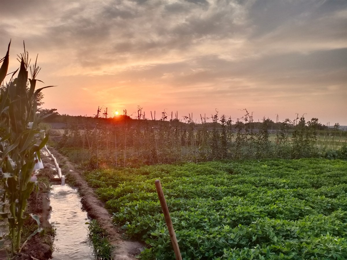 浇完地,落日余晖,霞光洒在水面上,静谧的菜园组成了一幅岁月静好的画面,我们满载着幸福和豆角黄瓜回家了,还说豆角吃不完送给大妗一些。