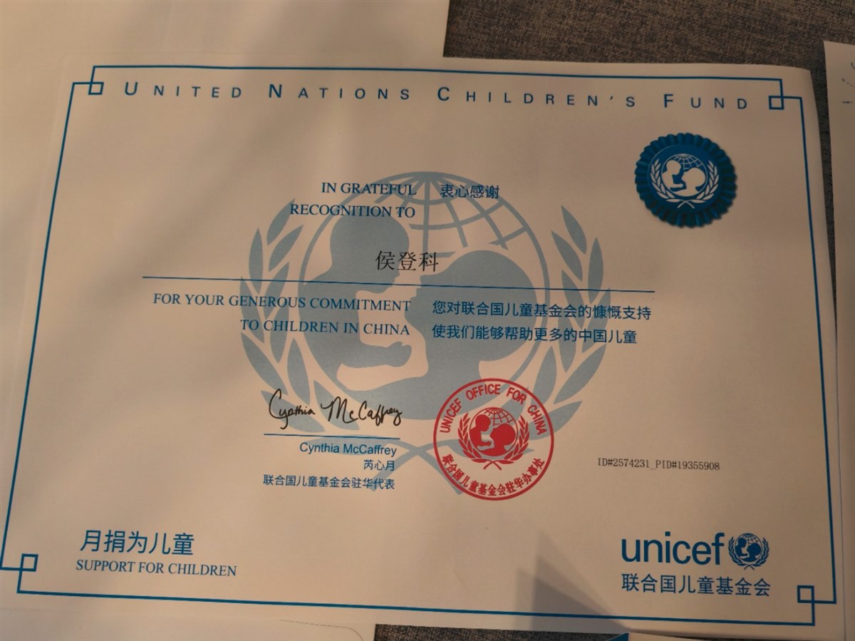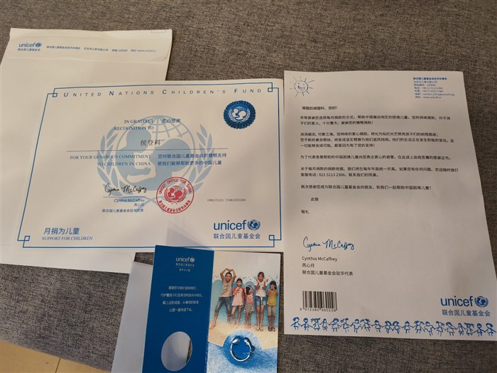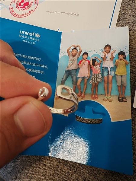 | 收到联合国儿童基金会的感谢信和戒指啦