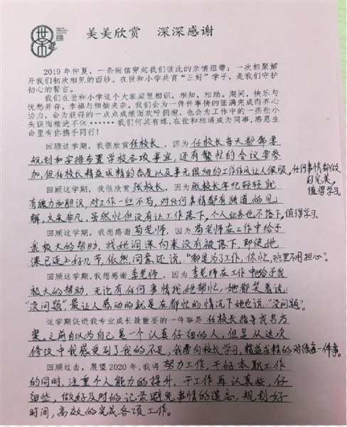 | 美美欣赏,深深感谢 ——从期末总结说团建 美是需要被发现的,被写下,被念出,被宣传,被感染……让一种美感染另外一种美,让美就在不经意之间蔓延,开出一片绝美的花,散发出阵阵袭人香气。 一、起点 对于一个新建校,有效的团建活动有利于凝聚教师的心,让许多颗心融合变成一颗心。这所有的开始,都要从一件具体事说起…… 从一起搬桌子,填充和装饰每一间教室开始,从热爱学校,用心装饰每一面墙壁和办公室开始,从一起见证和陪伴学校每年的成长开始…… 二、时间 团建活动可在年末或期末,一般一年一次即可。因为世和是新建校,就放在了学期末。 三、形式 首先固定《美美欣赏 深深感谢》固定模式,每次根据校情稍修改部分内容,打印出来发至每位教师的手里。为给予教师神秘感和新奇感,每年给教师打印的纸张的颜色可稍有不同(粉色、绿色、黄色……) 1.提前填写“美美欣赏,深深感谢”感恩卡。 2.现场由教师随机抽取感恩卡,并由该教师有感情地朗读出来,传递同事欣赏之情和感恩之意。 在读得过程就是一个享受美的过程,其中有发现美的眼睛,有具有美的特质的人,还有一批倾听美的同伴。 四、内容 (一)内容构架 每个人都要写欣赏 ,欣赏 , 感谢 ,感谢 。 这学期促进我专业成长最重要的一件事是 。 回顾过去,展望 ,我将 。 (二)最初的模样 五、设计和感知 (一)美的发现 1.多欣赏别人的优点,提倡良好的“嫉妒”——你好,我比你更好;而不是你好,我给你捣乱。树立一个正确的目标,实现良性地“嫉妒”勇于超越,奋力使劲儿,让自己更优秀地走在奋斗的道路上。 老师们写时,会回忆谁好,他好在哪?也会给予自己一个努力对标的方向,让自己变得更好。同时,欣赏别人时……被人欣赏时……都是一种发现美,传递美的过程。 注意:被夸奖的人更有自信,性格外向,更乐于助人。当然,也会有些教师不被夸,可能是因为他一直默默无闻地认真地工作,没有被及时看到,但是这样的教师肯定也是极好的教师。这时,就需要提前看所有老师书写的内容,如果只有极个别的教师没有被夸,那么可以告知大家因为时间缘故,只展示五六个(具体数量根据学校教师总量而定)教师书写的内容。 2.及时致谢,真诚感恩,拉近心灵距离。一学期的工作结束,老师们像抽盲盒般打开别人的盒子,传递别人的秘密与感谢,让同伴之间的默契与凝聚力增强,变成了可以互相分享彼此“秘密”的人。 (二)关键词 欣赏、感谢、尊重、理解、和谐 在这样互相欣赏和夸奖的氛围里,每位教师都看到了自己的美与价值,鼓励大家多做好事,传递正能力,其实也是一个树立好榜样的方式。 五、创新 从最初的一张张《美美欣赏 深深感谢》总结,到后来的《美美欣赏 深深感谢》我身边的故事……内容越来越多,故事越讲越有,身边那群可爱的伙伴,一直都温暖着彼此,给予彼此越来越多的温暖。 |