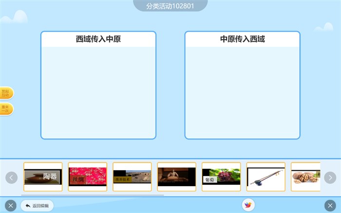 在设计意图上,“丝绸之路的开辟”这一子目的主要内容是让学生知道丝绸之路主要有两条路线——陆上丝绸之路和海上丝绸之路。另外,丝绸之路的开辟意义也是本子目的重点。一方面,丝绸之路促进了中原和西域地区经济文化的交流和民族关系的大发展;另一方面,丝绸之路成为亚欧大陆和东西方交流的通道,通过丝绸之路,中国的丝绸、造纸、火药、印刷术传到西方,同时佛教、伊斯兰教、阿拉伯的音乐舞蹈,以及许多的瓜果蔬菜,也沿着丝绸之路传入到了中国。丝绸之路把古代中国文明、古代印度文明、古代波斯文明和古代罗马文明联结起来,几大文明之间相互交融,相互渗透,从而促进了人类文明的进步。为了突破这一子目的两个重点,有效利用智慧课堂技术手段服务于教学,我主要采用了动态交互地图和分类活动等进行讲解。通过展示丝绸之路动态交互地图,让学生直观感受到两条路线的行进方向和主要经过的地点;通过分类活动,归纳总结中原和西域往来的经济、文化元素,让学生理解丝绸之路的开通促进了东西方经济文化的交流。