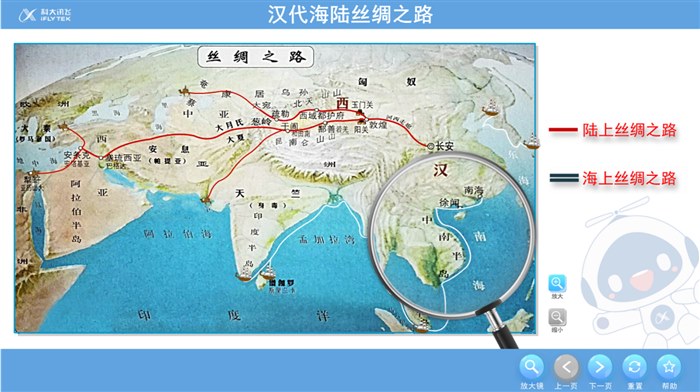 在教学过程中,我以情境创设的方式贯穿本环节。首先设置问题:“假如你是西汉时期来往于东西方的商人,如果你想到其他国家进行商品贸易,可选的路线有哪些”?通过设置这个问题,让学生带入情境,引发思考,并通过自主预习在课本上标划出陆上丝绸之路和海上丝绸之路。学生在自主预习完成之后,可以上台结合交互地图,叙述出两条道路的路线,其它同学依据课本予以对照矫正。学生在了解了海陆丝绸之路之后,教师此时抛出问题:“作为一名商人,我们既可以选择行走在大漠孤烟、驼铃声声的陆上丝绸之路,也可以选择航行在一望无际、碧海蓝天的海上丝绸之路。那么,当我们去往外国经商时,会带去哪些中国特产?在归途中,我们又会代购哪些国外进口商品或带回哪些流行元素?”,以此引发学生延伸思考,从而顺利过渡到下一环节——丝绸之路上中外文明交流的表现。