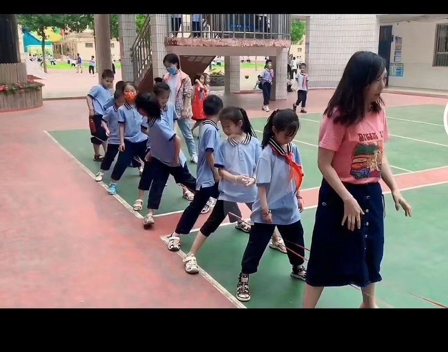 (图为我把90年代的跳皮筋游戏,带入到10后的课间中。)
