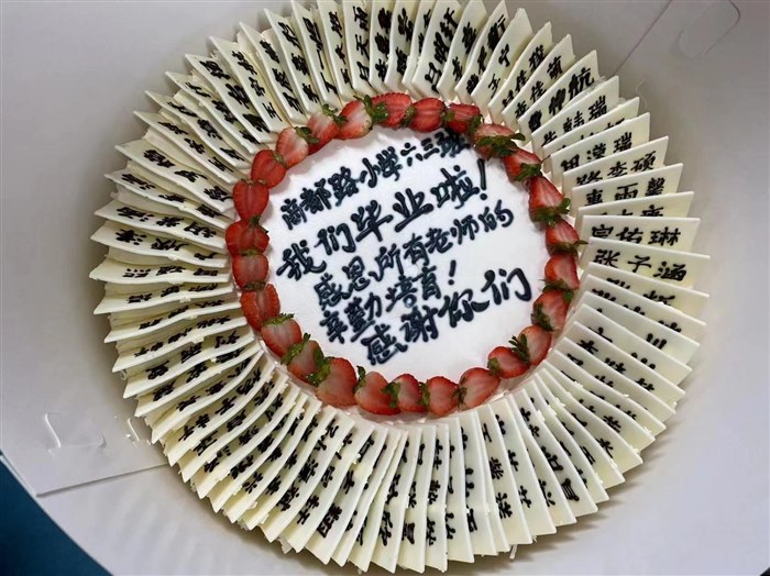 毕业了,要有一个不一样的毕业典礼,给你们一个美好的回忆,就在大家认为要出去站路队时,一个学生家长为孩子们送来了一个具有特殊意义的大蛋糕,祝福孩子们前程无量: