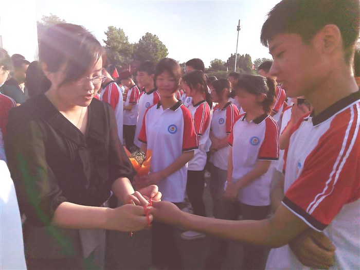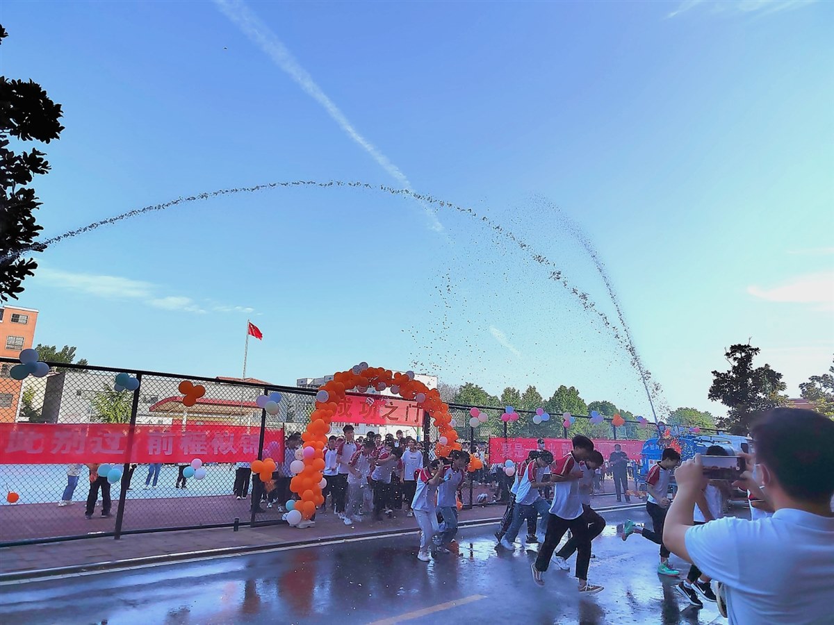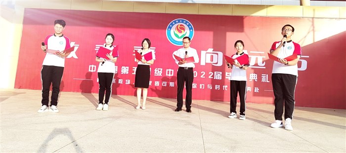 毕业生跑步进入会场,途中和自己的众多老师击掌祝福加油,背景音乐《凤凰花开的路口》,加上班主任老师的动员煽情,还有就是明天就要参加2022年的河南省中考的时光隘口,现场气氛一下子就被调动了起来;然后是全体起立,升国旗,奏唱国歌,我们绝不放过过任何一个对孩子们进行爱国主义的教育;由两名教师和四名学生共同参与的情景诗朗诵《遇见五中,预见未来》,既让每一个孩子回想起了自己三年前刚踏进初中校门的青涩和懵懂,又能够坚定孩子们对未来的渴望和信心;然后分别是优秀学生、教师和家长的发言;感念师恩,学生给老师送鲜花,班主任给学生送祝福、送向日葵花(寓意一举夺魁);校长讲话,鼓起孩子们自信的风帆;孩子们以班级为单位重温班级宣誓词,孩子们激情四射、朝气蓬勃,呼号声一浪高过一浪;参与领导为孩子们颁发毕业证书(以班级为单位统一颁发);授班旗环节,先有校领导将班级旗授予现在的九年级各班班长,再有九年级各班班长将班级旗转交于现在的八年级各班班长,因为暑假过后,他们就是崭新的一届毕业班了;领导、师生、生生互戴“金榜题名”手链,并进行集体宣誓,接连大呼三声“中考必胜”;最后一个环节是走红毯、过水门(寓意鱼跃龙门),事先邀请两辆小型洒水车,用高压水枪冲起一座高大的水门,孩子们跑过水门仪式结束,回到班级等候进行核酸检测,然后打点行囊回家,下午四点到考点认考场。因为疫情,只有极个别的家长莅临了毕业典礼现场,大多数的家长只能够在手机上观看盛况和孩子们开心的样子,孩子们哪怕是被淋成了“落汤鸡”也笑得很灿烂。因为这是他们人生中的第一次高光时刻,他们生逢伟大时代,他们前程似锦,他们本身就是一束光、一团火焰、一捧娇艳的花朵。