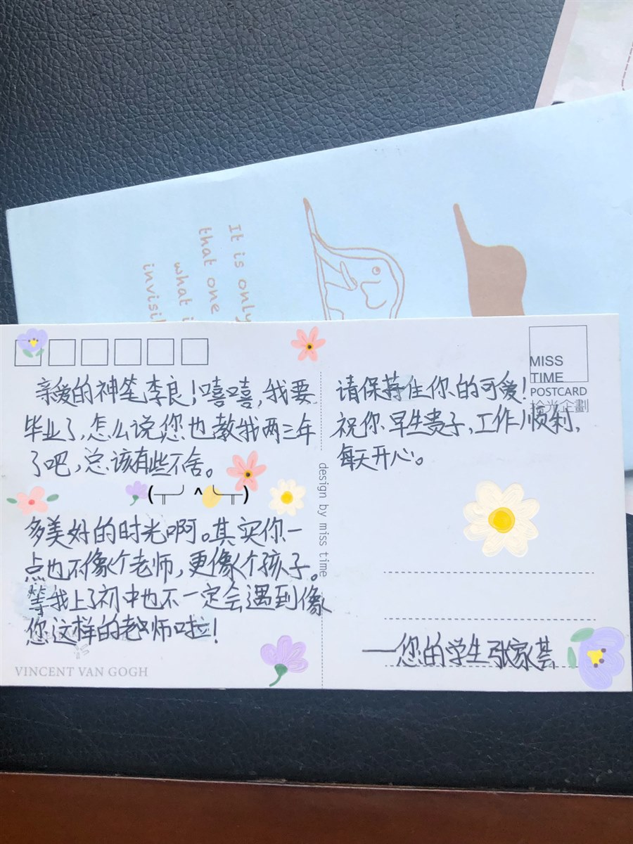 当我看到“神笔李良”这四个字,不用看最后的署名,我已经猜到是社团的哪个学生了。 这个女生刚开始很不起眼,画画水平也不名列前茅,但是不知道从什么时候,她和社团的其他一些女生在这几年的光阴里,竟悄悄的生根发芽,她们疯狂汲取养分,终于在六年级开出了灿烂的花。我经常开玩笑说,她们几个就是我的顶梁柱,扛起了社团的半边天。还自封“富士康的老板”,她们几个就是里面兢兢业业的打工仔,常常给她们几个逗的哈哈大笑,再加上她们觉得我好相处,画画又很专业,所以一有困难一有心事她们就会跟我说,又或是向我请教,在这一点我是他们的长辈。 可我又觉得不是,正如她在信里提到的,我仿佛是个孩子,她说的可一点儿也没错。我想起了那年要往墙上粘画,我因为怕伤害墙面而抓耳挠腮时,跟她们几个撒娇似的抱怨,结果她却替我想到了好办法,最后我们几个用画画胶带解决了这个事情。我疯狂夸奖她们,她笑着说,老师你看,关键时候还得我们来帮你。 也许在学生面前孩子气不是一件坏事,也许试着放下自己的面具和盔甲不是一件坏事,也许给她们一个帮助你的机会也不是一件坏事。 我愿意相信她们,依靠她们,不只是我可以安慰学生,学生也可以安慰老师。 回顾教学生画画的这些时光,我从新手教师慢慢成长的游刃有余,社团的孩子们也从青涩慢慢长成了比我还高的少年少女们。 云山沧沧,江水泱泱,先生之风,山高水长。令公桃李满天下,何用堂前更种花。新竹高于旧竹枝,全凭老干为扶持。三尺讲台存日月,一支粉笔写春秋,桃李不言,下自成蹊,饮其流者怀其源,学其成时念吾师。天长地久有时尽,师恩绵绵无绝期。 即使是没有鲜花的舞台,或者没有掌声的独白,但总能让每一种颜色盛开。谢谢你,做我平淡岁月里的星辰。 一个平凡的称谓,一生不平凡的使命。孩子啊,希望我们都要在自己的“事业”中茁壮发展。 |
