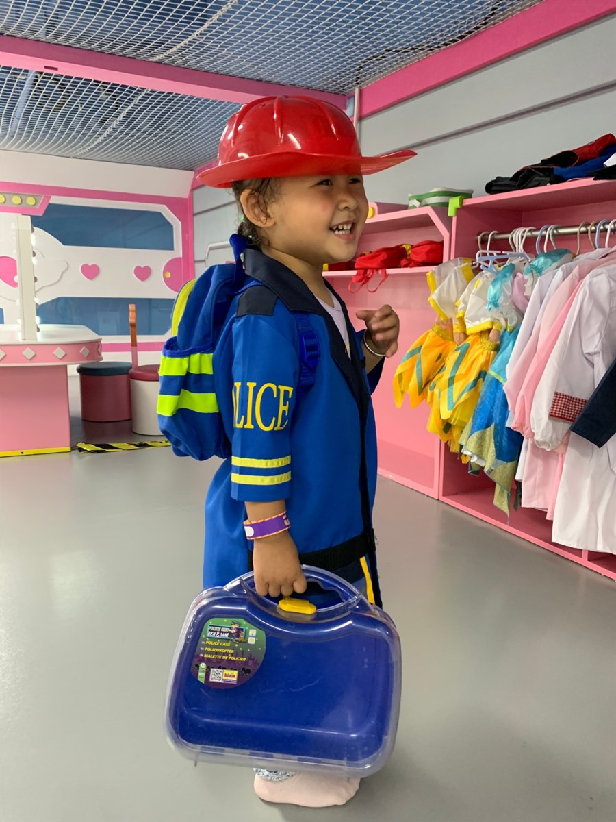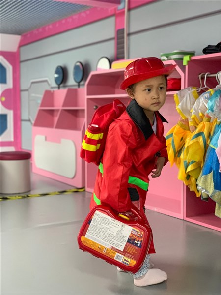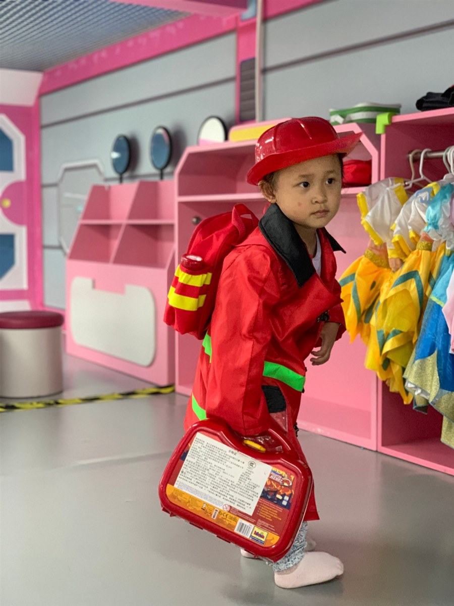 大概意思是:爸爸在游乐场的角落坐了几分钟,刷了一下手机,结果抬头就看不到孩子了。自己在周围找了几圈也没有找到,最后在游乐场的“换衣角”找到了。爸爸上去的时候,大宝已经把自己的衣服脱掉,换上了一套消防员的衣服,咧着嘴像爸爸炫耀自己的成果。爸爸看她头上戴的帽子,手里提的消防员的箱子,惊喜大过了惊吓。大宝怎么可以这么可爱,怎么能自己到这来并找了消防员的衣服,还知道搭配帽子和箱子。所以他迫不及待的给我分享他的喜悦。