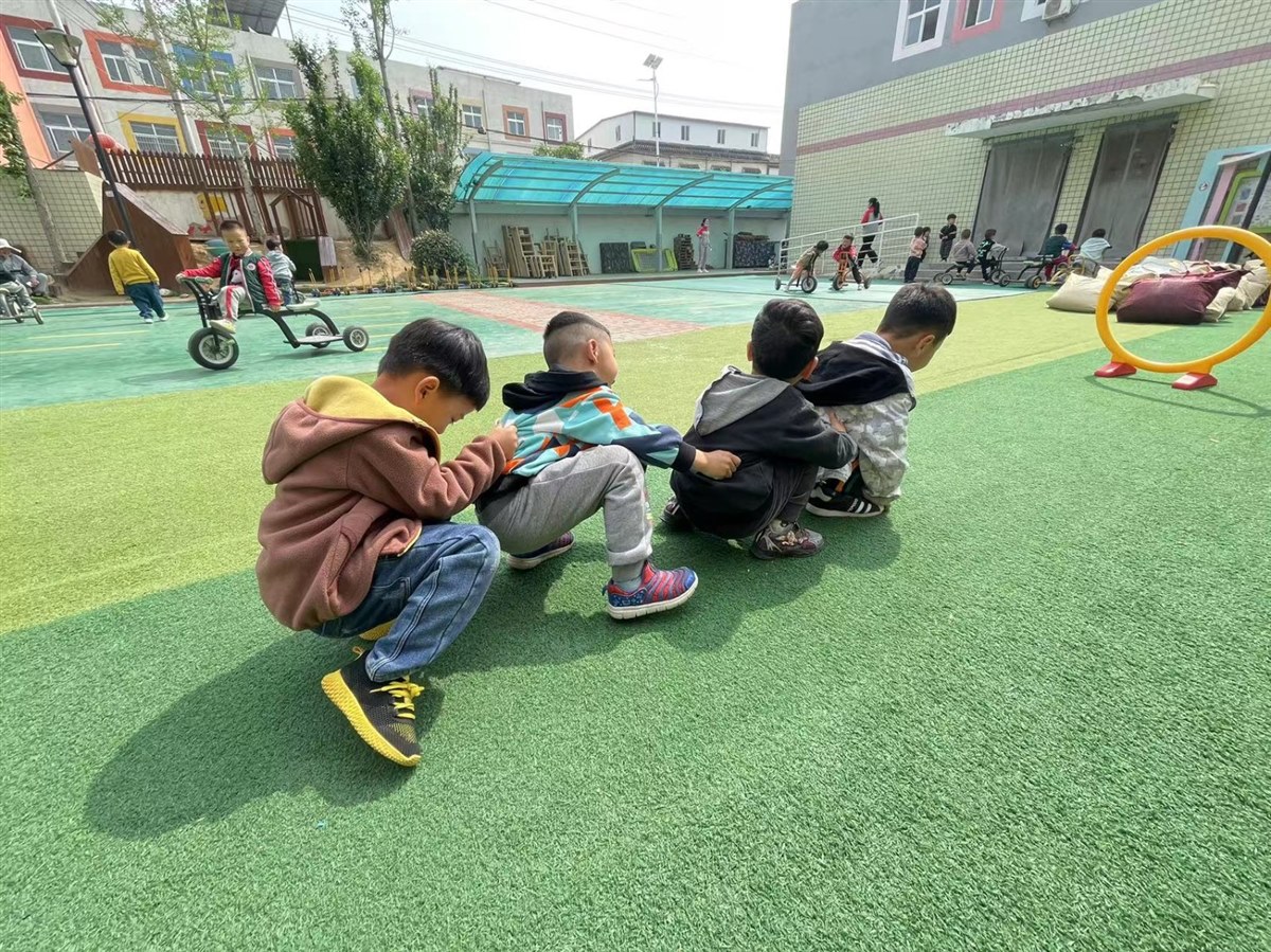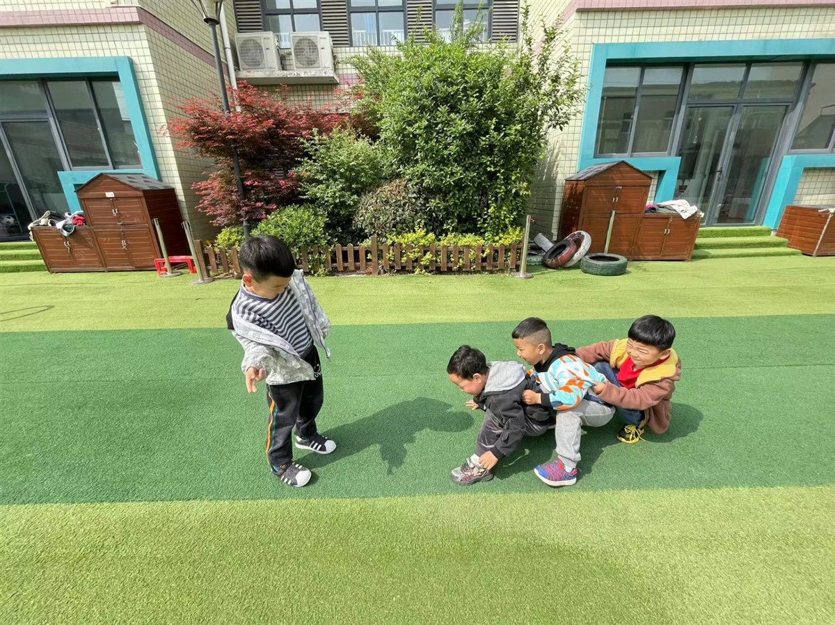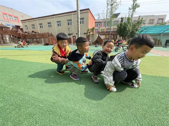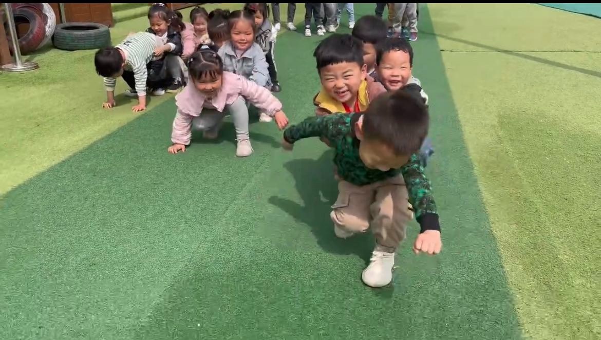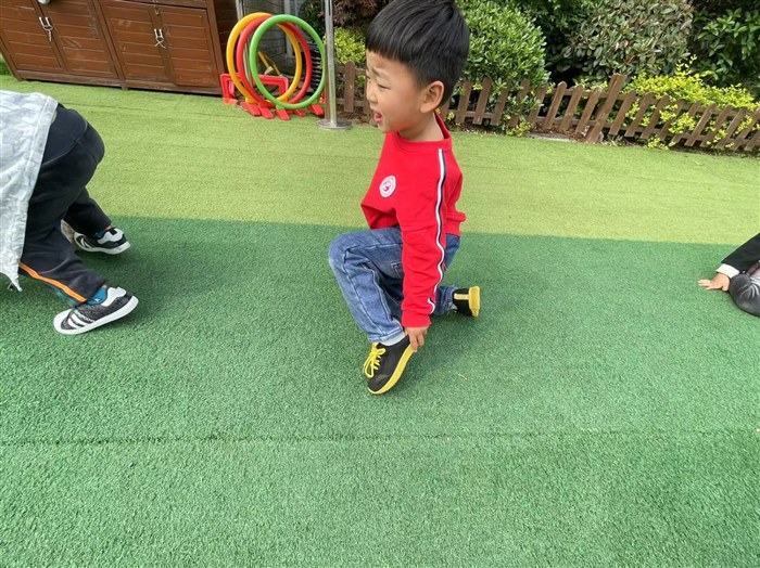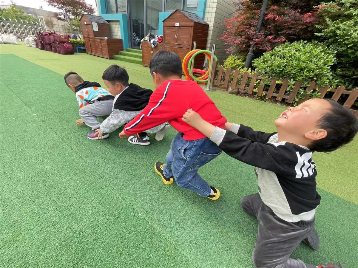 今天下午户外活动,小二班又一次进行这个民间游戏“蜈蚣竞走”,在前几轮游戏中,孩子们还是会出现鞋踩掉、突然走散的状况(见图1、图2)。  在经过几番大战以后,郭凡耀小朋友突然从队伍里站起来说:“老师我知道怎么办了,我会了。”老师请他陈述游戏要领,他说:“就是蹲在地上,手要抓住前面小朋友腰间的衣服,不可以随便松手,而且走的时候要伸同一边的脚,这样大家就不会踩到别人的鞋子了。”于是在老师的同意下,李沛霖、李易恒、李晨溪三人由郭凡耀小朋友带领着去旁边的场地开始了游戏探索。 前两轮尝试的时候郭凡耀带领的小伙伴还是会出现踩着鞋子的问题,这时郭凡耀说:“这次我来指挥,我指哪边的腿我们就出哪边的腿。”只见他从“蜈蚣身体”上分离出来,成为一个指挥员,他随机伸手指出要行走的那边腿,队员们看到手势作出反应,就这样两边交替慢慢前进着(见图3),见图3)而且嘴里还整齐地喊着:“一二一二”的口号。 接着又有两三个小朋友在看到郭凡耀他们玩游戏的指挥形式,也纷纷去模仿他们,跟着郭凡耀小朋友当起了指挥员,时不时还进行了角色交换,小组里的其他小朋友也体验了一次当“小指挥员”的快乐。起初这些“蜈蚣”队伍行走的速度慢,偶尔出现断裂,但是不一会儿孩子们的练习就取得了显著成效,大部分孩子都可以在四人小组中稳步蹲走,并且保持“蜈蚣”同手同脚行走不散开。这样的独自练习差不多维持了七八分钟,这时郭凡耀向旁边的“蜈蚣”小分队发出了挑战,两只“小蜈蚣”开始了比赛,其中郭凡耀这一组的小蜈蚣就喊着:“一二一二”的口号整齐前进着,孩子们在前进的过程中说:“我们摇晃起来吧,像海盗船一样,朝一个方向摇晃。”(见图4) 最终郭凡耀这一组率先到达了终点,并且保持蜈蚣队形没有散开,成为了本轮游戏的冠军(见图5)。后续接二连三有别的蜈蚣小分队向郭凡耀他们的冠军小分队发起挑战(见图6),在经过三轮大战后,郭凡耀率先放弃游戏,他说:“这样蜈蚣走,真是太累了,我的腿都要断掉了。不玩了,不玩了。”今天的游戏就进入了中场休息。整个游戏持续了不到十五分钟。