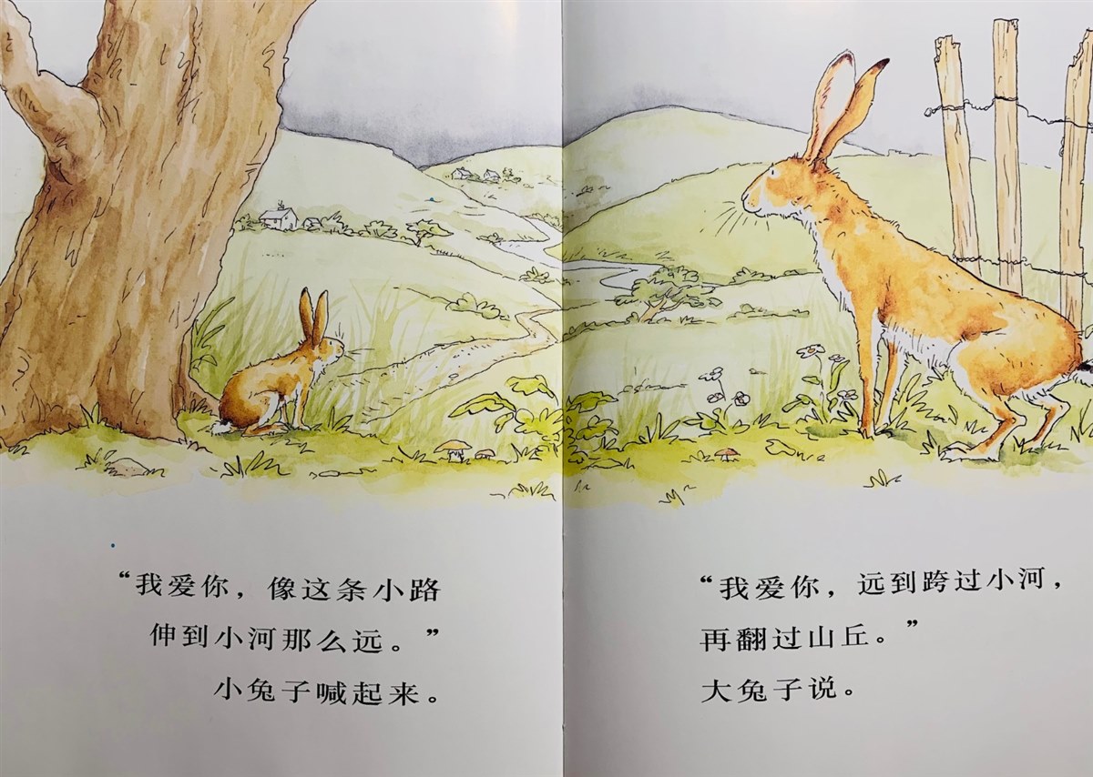 | 猜猜我有多爱你 给孩子买了好多本幼儿绘本,而我最喜欢带她一起看山姆·麦克布雷尼的《猜猜我有多爱你》。喜欢这个绘本不是因为它的内容有多么的惊艳,也不是因为它的插图有多么的精美,而是简单的故事里通过浅浅的动作,表现出来了深深的爱,也让我知道孩子有多么的爱妈妈! 绘本描述的是小栗色兔子宝宝和大栗色兔子妈妈的故事。小栗色兔子睡觉前一定要大栗色兔子“猜猜我有多爱你”,大栗色兔子说:“哦,这我可猜不出来。”于是,小栗色兔子用了各种各样的姿势表现他对大栗色兔子的爱! 他把手臂张开到最大,说“这么多!” 他把手举得高的不能再高,说“我的手举得有多高,我就有多爱你” 他一会又倒立,说他爱大栗色兔子,从头到脚。 他看见小河又说:他爱大栗色兔子就像小路伸到小河那么远....... 然而,每一次,大栗色兔子都会有更张开的手臂,举得更高的手,更长距离的从头到脚,爱小栗色兔子远到跨过小河,再翻过山丘....小栗子兔子都会特别特别地羡慕,我要是有这么爱大栗色兔子就好了,他一直在努力想怎们表现很爱大栗色兔子。想啊,想啊,不禁进入了梦乡......