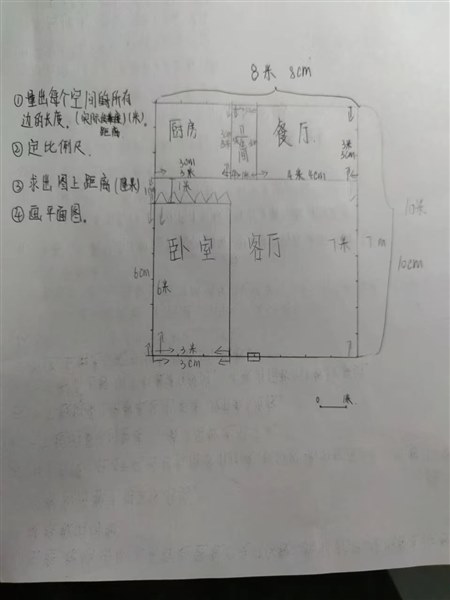 在六年级下册第四单元《比例》的时候,本来知识就比较抽象,又碰上疫情要进行线上学习,这样就给我吓一跳。平常面对面教的时候,有些学生还想象不出来正比例、反比例、比例尺等如何解决生活中的问题,更何况是学生在家学习。就像专家说得那样,学生认识鼻子,也认识耳朵和嘴,如果把他们组合在一起就一片混乱,不知道它们都应该放在哪个位置比较合适了。 学习完这一单元的知识后,我没有布置与学生不大相及的问题来巩固他们所学的知识。这样的问题会的学生已经从模仿中发现一些方法,不会的学生还是绕不过知识间的坎,就只是看看老师布置的作业,不会思考怎么去解决。我改变自己以往的作业思路,经过认真地思考给学生只布置一道作业题:“请大家设计出你的卧室的平面图,画在A4纸上!”学生看了当天的作业简直是高兴极了,真少!学生被作业的量所迷惑,他们没有想到就这一道题做起来会多复杂,需要自己会综合应用本单元所学的相关知识。