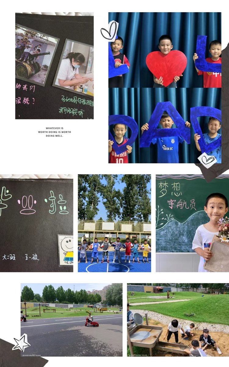 前两天儿子的幼儿园举行了毕业典礼,听老师们说,几天都是忙到凌晨一两点才回家。儿子的毕业手册,写满了老师的祝福。那每一张上都记录着孩子的成长足迹:第一次入园的鲤鱼跳龙门游戏,第一次跟小朋友的自我介绍,第一次野营,第一次水枪大战,第一次跟小伙伴组队打篮球,第一次跟老师CS大战等等,太多的第一次都被老师用心的拿手机拍下来,并打印成照片,送给每位孩子。想一想多么巨大的工程!每位孩子的成长手册都是老师制作并且手写出来。看着儿子每一张发自内心的笑容,我只想说:王老师,连老师,张老师谢谢您们,谢谢您们用心陪伴和无微不至的爱护,您们辛苦了,替所有大二班孩子们谢谢您们!正是您们的爱心,细心,责任心和包容心,让孩子快乐的度过了幼儿园最美好和难忘的时光!