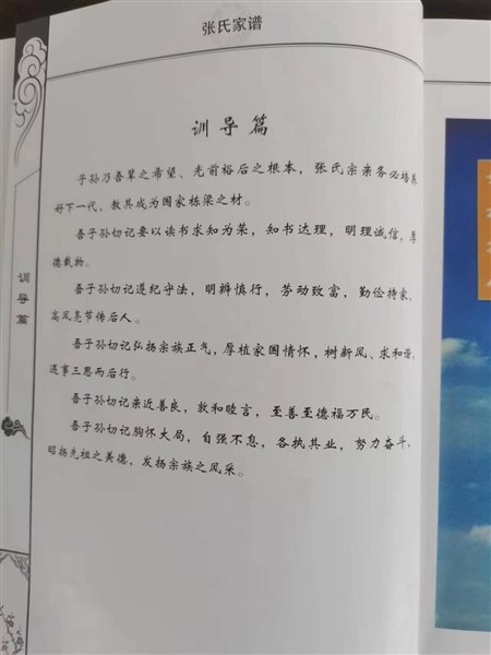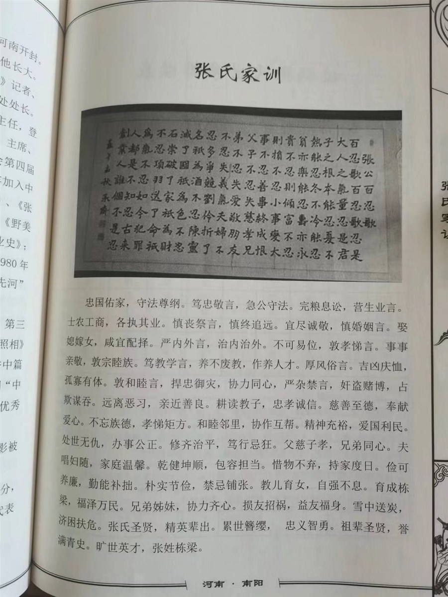 张氏家训的首句,让我心潮澎湃。“忠国佑家,守法尊纲。笃忠敬言,争公守法。”