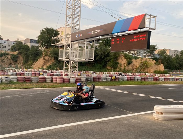 今天,温度高达39度,但是依然阻挡不了我和妈妈去樱桃沟卡丁车赛场的脚步。 下午6:30我们到达了卡丁车休息室,人挺多的,大家有序的排队。双人车和单人车各一队,我和妈妈第一局决定开双人卡丁车。我挑了一个浅蓝色的头盔和一个绿色的防撞背心,给妈妈也挑了一个炫酷的黑色头盔。终于,在排了半个小时的队之后,我和妈妈开上了卡丁车。这是我第一次开卡丁车,它就像是一个迷你版的赛车,颜色特别亮眼,底盘特别低,没有挡风玻璃,发动机声音非常大。 工作人员挥动黑白相间的马赛克图案的旗子,发出开动指令。我在主驾驶位,一踩油门,轰的一声,卡丁车冲进赛道。卡丁车的速度真快,到转弯的时候,车不动了,我一看原来妈妈因为害怕一直踩着刹车。我赶忙叫妈妈松开刹车,卡丁车又跑起来了,速度不知不觉达到了50码,感觉快飞起来了,很刺激。一局很快就结束了,感觉意犹未尽,于是第二局我和妈妈分开开了单人卡丁车。开单人车时,我先跟着妈妈,后来嫌她慢吞吞,于是超过了她。可是好景不长,在一个弯道处马失前蹄,被后一辆车追尾,开到了草堆里,好在整个赛场防护措施很安全,有惊无险。